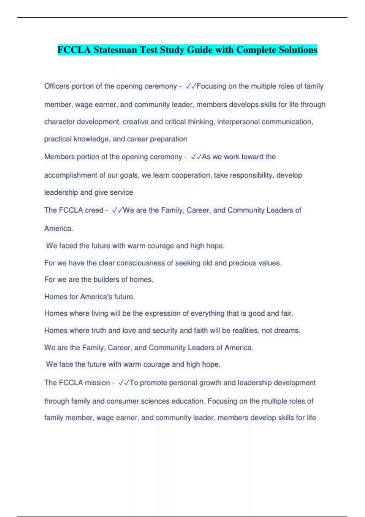 FCCLA Statesman Test Study Guide with Complete Solutions Officers portion of the opening ceremony - Focusing on the multiple roles of family member, wage earner, and community leader, members develops skills for life through character development, creative and critical thinking, interpersonal communication, practical knowledge, and career preparation Members portion of the opening ceremony - As we work toward the accomplishment of our goals, we learn cooperation, take responsibility, develop leadership and give service The FCCLA creed - We are the Family, Career, and Community Leaders of America. We faced the future with warm courage and high hope. For we have the clear consciousness of seeking old and precious values. For we are the builders of homes, Homes for America's future. Homes where living will be the expression of everything that is good and fair. Homes where truth and love and security and faith will be realities, not dreams. We are the Family, Career, and Community Leaders of America. We face the future with warm courage and high hope. The FCCLA mission - To promote personal growth and leadership development through family and consumer sciences education. Focusing on the multiple roles of family member, wage earner, and community leader, members develop skills for life