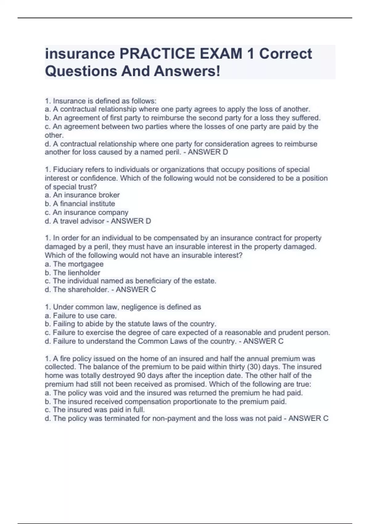 Insurance PRACTICE EXAM 1 Correct Questions And Answers! 1. Insurance is defined as follows: a. A contractual relationship where one party agrees to apply the loss of another. b. An agreement of first party to reimburse the second party for a loss they suffered. c. An agreement between two parties where the losses of one party are paid by the other. d. A contractual relationship where one party for consideration agrees to reimburse another for loss caused by a named peril. - ANSWER D 1. Fiduciary refers to individuals or organizations that occupy positions of special interest or confidence. Which of the following would not be considered to be a position of special trust? a. An insurance broker b. A financial institute c. An insurance company d. A travel advisor - ANSWER D 1. In order for an individual to be compensated by an insurance contract for property damaged by a peril, they must have an insurable interest in the property damaged. Which of the following would not have an insurable interest? a. The mortgagee b. The lienholder c. The individual named as beneficiary of the estate. d. The shareholder. - ANSWER C 1. Under common law, negligence is defined as a. Failure to use care. b. Failing to abide by the statute laws of the country. c. Failure to exercise the degree of care expected of a reasonable and prudent person. d. Failure to understand the Common Laws of the country. - ANSWER C 1. A fire policy issued on the home of an insured and half the annual premium was collected. The balance of the premium to be paid within thirty (30) days. The insured home was totally destroyed 90 days after the inception date. The other half of the premium had still not been received as promised. Which of the following are true: a. The policy was void and the insured was returned the premium he had paid. b. The insured received compensation proportionate to the premium paid. c. The insured was paid in full. d. The policy was terminated for non-payment and the loss was not paid - ANSWER C