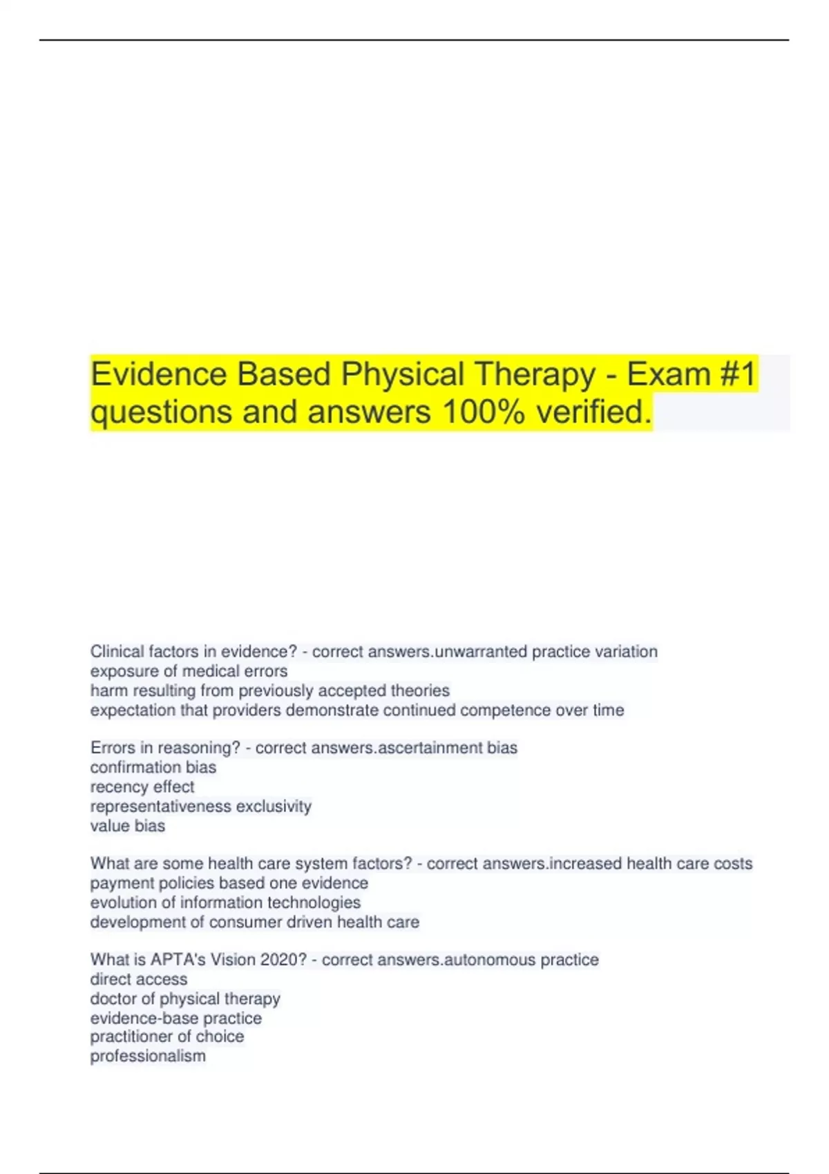 Evidence Based Physical Therapy - Exam #1 questions and answers 100% verified. Clinical factors in evidence? - correct ranted practice variation exposure of medical errors harm resulting from previously accepted theories expectation that providers demonstrate continued competence over time Errors in reasoning? - correct tainment bias confirmation bias recency effect representativeness exclusivity value bias What are some health care system factors? - correct ased health care costs payment policies based one evidence evolution of information technologies development of consumer driven health care What is APTA's Vision 2020? - correct omous practice direct access doctor of physical therapy evidence-base practice practitioner of choice professionalism What is the patient/client management model? - correct answers.1. examination 2. evaluation 3. diagnosis 4. prognosis 5. intervention 6. outcomes What is patient-centered car