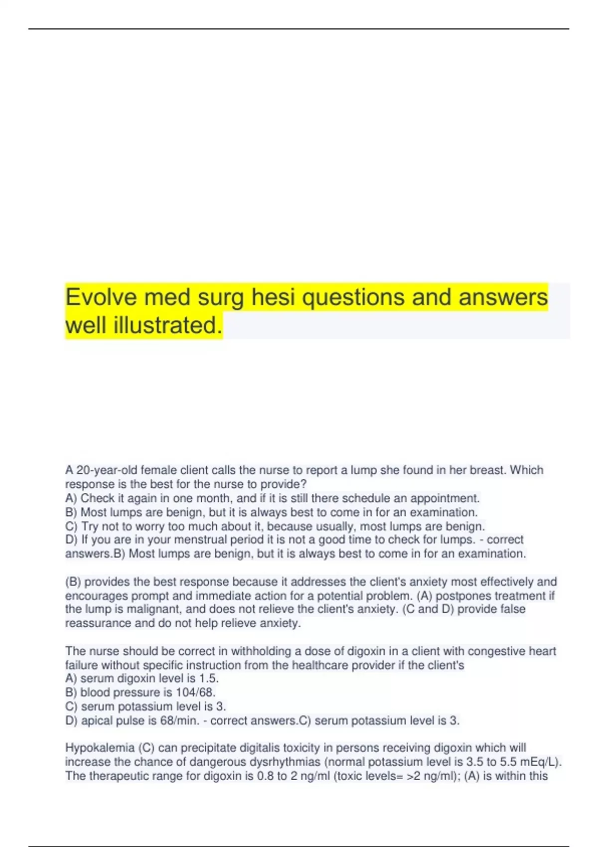 Evolve med surg hesi questions and answers well illustrated. A 20-year-old female client calls the nurse to report a lump she found in her breast. Which response is the best for the nurse to provide? A) Check it again in one month, and if it is still there schedule an appointment. B) Most lumps are benign, but it is always best to come in for an examination. C) Try not to worry too much about it, because usually, most lumps are benign. D) If you are in your menstrual period it is not a good time to check for lumps. - correct answers.B) Most lumps are benign, but it is always best to come in for an examination. (B) provides the best response because it addresses the client's anxiety most effectively and encourages prompt and immediate action for a potential problem. (A) postpones treatment if the lump is malignant, and does not relieve the client's anxiety. (C and D) provide false reassurance and do not help relieve anxiety. The nurse should be correct in withholding a dose of digoxin in a client with congestive heart failure without specific instruction from the healthcare provider if the client's A) serum digoxin level is 1.5. B) blood pressure is 104/68. C) serum potassium level is 3. D) apical pulse is 68/min. - correct answers.C) serum potassium level is 3. Hypokalemia (C) can precipitate digitalis toxicity in persons receiving digoxin which will increase the chance of dangerous dysrhythmias (normal potassium level is 3.5 to 5.5 mEq/L). The therapeutic range for digoxin is 0.8 to 2 ng/ml (toxic levels= >2 ng/ml); (A) is within this range. (B) would not warrant the nurse withholding the digoxin. The nurse should withhold the digoxin if the apical pulse is less than 60/min (D). In assessing a client diagnosed with primary hyperaldosteronism, the nurse expects the laboratory test results to indicate a decreased serum level of which substance? A) Sodium. B) Antidiuretic hormone. C) Potassium. D) Glucose. - correct answers.C) Potassium. Clients with primary aldosteronism exhibit a profound decline in the serum levels of potassium (C) (hypokalemia)--hypertension is the most prominent and universal sign. (A) is normal or elevated, depending on the amount of water reabsorbed with the sodium. (B) is decreased with diabetes insipidus. (D) is not affected by primary aldosteronism. Based on the analysis of the client's atrial fibrillation, the nurse should prepare the client for which treatment protocol? A) Diuretic therapy. B) Pacemaker implantation. C) Anticoagulation therapy. D) Cardiac catheterization. - correct answers.C) Anticoagulation therapy. The client is experiencing atrial fibrillation, and the nurse should prepare the client for anticoagulation therapy (C)