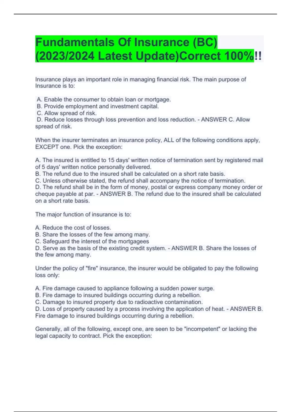 Fundamentals Of Insurance (BC)(2023/2024 L Insurance plays an important role in managing financial risk. The main purpose of Insurance is to: A. Enable the consumer to obtain loan or mortgage. B. Provide employment and investment capital. C. Allow spread of risk. D. Reduce losses through loss prevention and loss reduction. - ANSWER C. Allow spread of risk. When the insurer terminates an insurance policy, ALL of the following conditions apply, EXCEPT one. Pick the exception: A. The insured is entitled to 15 days' written notice of termination sent by registered mail of 5 days' written notice personally delivered. B. The refund due to the insured shall be calculated on a short rate basis. C. Unless otherwise stated, the refund shall accompany the notice of termination. D. The refund shall be in the form of money, postal or express company money order or cheque payable at par. - ANSWER B. The refund due to the insured shall be calculated on a short rate basis. The major function of insurance is to: A. Reduce the cost of losses. B. Share the losses of the few among many. C. Safeguard the interest of the mortgagees D. Serve as the basis of the existing credit system. - ANSWER B. Share the losses of the few among many. Under the policy of "fire" insurance, the insurer would be obligated to pay the following loss only: A. Fire damage caused to appliance following a sudden power surge. B. Fire damage to insured buildings occurring during a rebellion. C. Damage to insured property due to radioactive contamination. D. Loss of property caused by a process involving the application of heat. - ANSWER B. Fire damage to insured buildings occurring during a rebellion. atest Update)Correct 100%!!