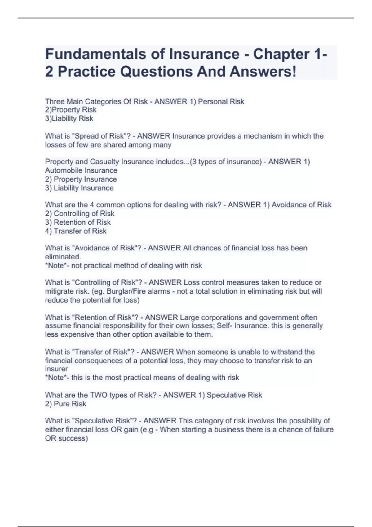 Fundamentals of Insurance - ChapterThree Main Categories Of Risk - ANSWER 1) Personal Risk 2)Property Risk 3)Liability Risk What is "Spread of Risk"? - ANSWER Insurance provides a mechanism in which the losses of few are shared among many Property and Casualty Insurance includes...(3 types of insurance) - ANSWER 1) Automobile Insurance 2) Property Insurance 3) Liability Insurance What are the 4 common options for dealing with risk? - ANSWER 1) Avoidance of Risk 2) Controlling of Risk 3) Retention of Risk 4) Transfer of Risk What is "Avoidance of Risk"? - ANSWER All chances of financial loss has been eliminated. *Note*- not practical method of dealing with risk What is "Controlling of Risk"? - ANSWER Loss control measures taken to reduce or mitigrate risk. (eg. Burglar/Fire alarms - not a total solution in eliminating risk but will reduce the potential for loss) What is "Retention of Risk"? - ANSWER Large corporations and government often assume financial responsibility for their own losses; Self- Insurance. this is generally less expensive than other option available to them. What is "Transfer of Risk"? - ANSWER When someone is unable to withstand the financial consequences of a potential loss, they may choose to transfer risk to an 1- 2 Practice Questions And Answers!