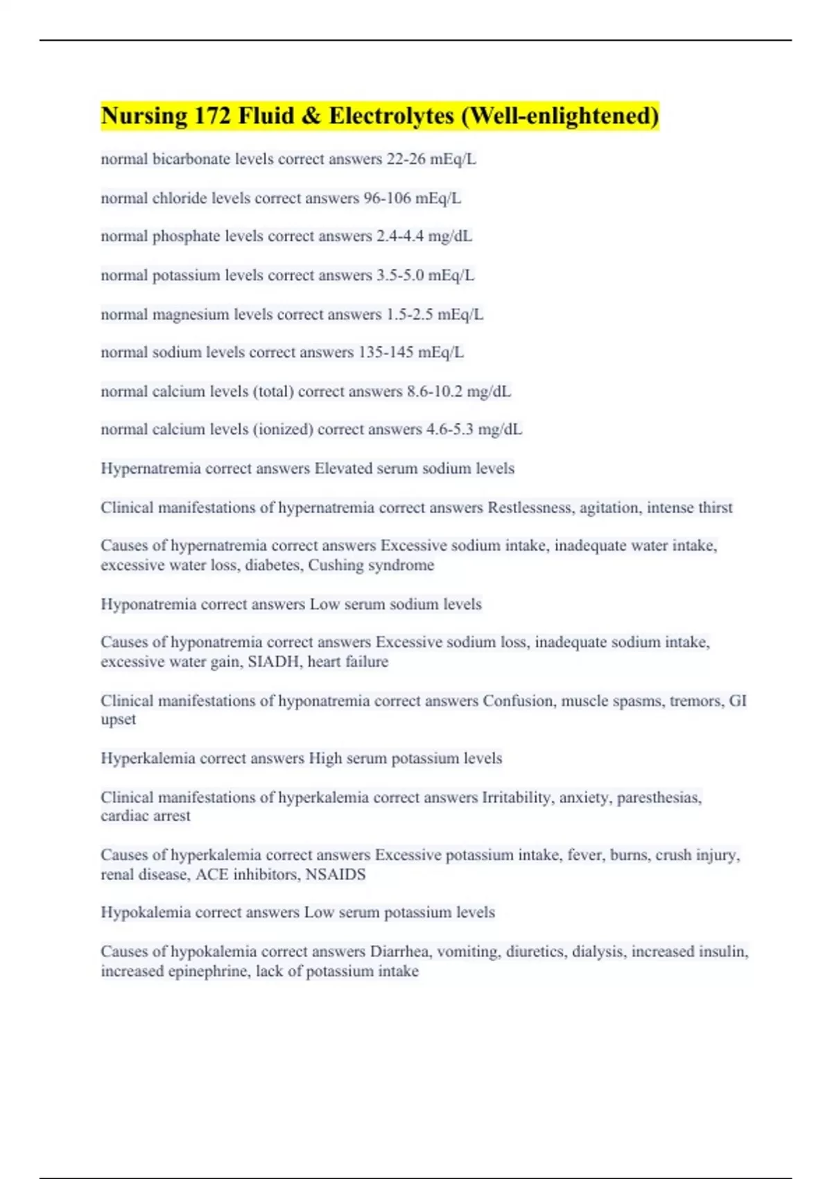 normal bicarbonate levels correct answers 22-26 mEq/L normal chloride levels correct answers 96-106 mEq/L normal phosphate levels correct answers 2.4-4.4 mg/dL normal potassium levels correct answers 3.5-5.0 mEq/L normal magnesium levels correct answers 1.5-2.5 mEq/L normal sodium levels correct answers 135-145 mEq/L normal calcium levels (total) correct answers 8.6-10.2 mg/dL normal calcium levels (ionized) correct answers 4.6-5.3 mg/dL Hypernatremia correct answers Elevated serum sodium levels Clinical manifestations of hypernatremia correct answers Restlessness, agitation, intense thirst Causes of hypernatremia correct answers Excessive sodium intake, inadequate water intake, excessive water loss, diabetes, Cushing syndrome Hyponatremia correct answers Low serum sodium levels Causes of hyponatremia correct answers Excessive sodium loss, inadequate sodium intake, excessive water gain, SIADH, heart failure Clinical manifestations of hyponatremia correct answers Confusion, muscle spasms, tremors, GI upset Hyperkalemia correct answers High serum potassium levels Clinical manifestations of hyperkalemia correct answers Irritability, anxiety, paresthesias, cardiac arrest Causes of hyperkalemia correct answers Excessive potassium intake, fever, burns, crush injury, renal disease, ACE inhibitors, NSAIDS Hypokalemia correct answers Low serum potassium levels Causes of hypokalemia correct answers Diarrhea, vomiting, diuretics, dialysis, increased insulin, increased epinephrine, lack of potassium intake