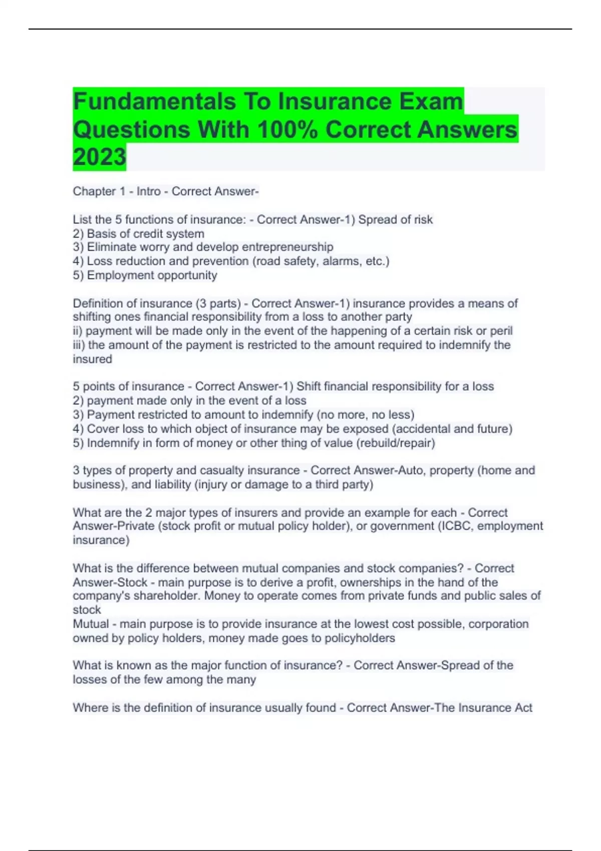 Fundamentals To Insurance Exam Questions With 100% Correct Answers 2023