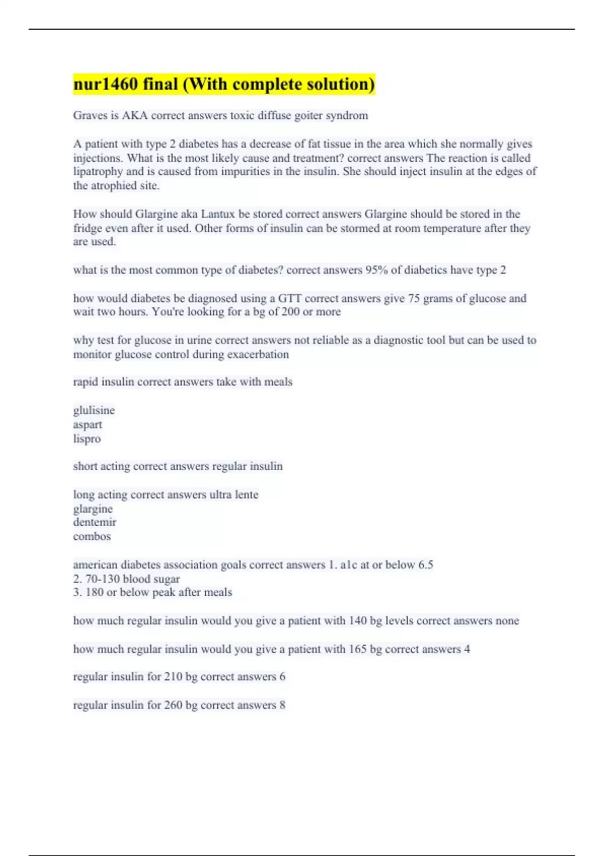 Graves is AKA correct answers toxic diffuse goiter syndrom A patient with type 2 diabetes has a decrease of fat tissue in the area which she normally gives injections. What is the most likely cause and treatment? correct answers The reaction is called lipatrophy and is caused from impurities in the insulin. She should inject insulin at the edges of the atrophied site. How should Glargine aka Lantux be stored correct answers Glargine should be stored in the fridge even after it used. Other forms of insulin can be stormed at room temperature after they are used. what is the most common type of diabetes? correct answers 95% of diabetics have type 2 how would diabetes be diagnosed using a GTT correct answers give 75 grams of glucose and wait two hours. You're looking for a bg of 200 or more why test for glucose in urine correct answers not reliable as a diagnostic tool but can be used to monitor glucose control during exacerbation rapid insulin correct answers take with meals glulisine aspart lispro short acting correct answers regular insulin long acting correct answers ultra lente glargine dentemir combos american diabetes association goals correct answers 1. a1c at or below 6.5 2. 70-130 blood sugar 3. 180 or below peak after meals how much regular insulin would you give a patient with 140 bg levels correct answers none how much regular insulin would you give a patient with 165 bg correct answers 4 regular insulin for 210 bg correct answers 6 regular insulin for 260 bg correct answers 8