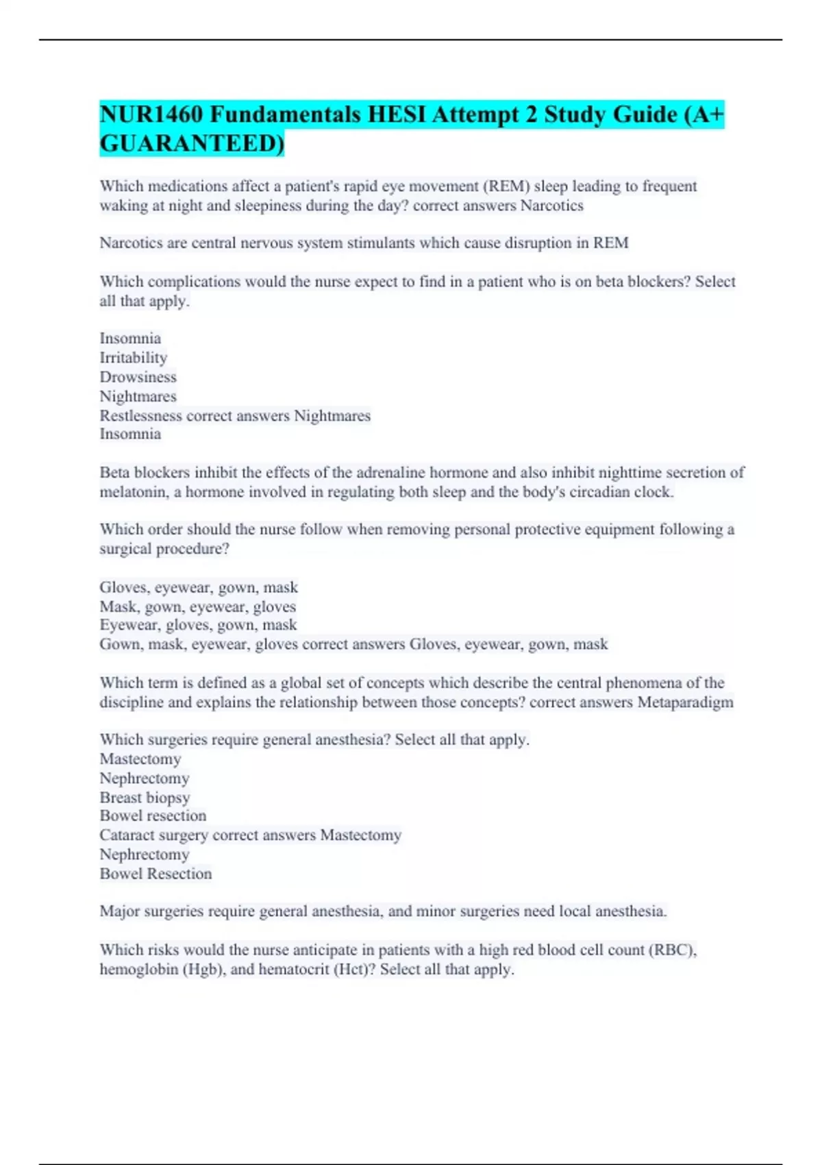 Which medications affect a patient's rapid eye movement (REM) sleep leading to frequent waking at night and sleepiness during the day? correct answers Narcotics Narcotics are central nervous system stimulants which cause disruption in REM Which complications would the nurse expect to find in a patient who is on beta blockers? Select all that apply. Insomnia Irritability Drowsiness Nightmares Restlessness correct answers Nightmares Insomnia Beta blockers inhibit the effects of the adrenaline hormone and also inhibit nighttime secretion of melatonin, a hormone involved in regulating both sleep and the body's circadian clock. Which order should the nurse follow when removing personal protective equipment following a surgical procedure? Gloves, eyewear, gown, mask Mask, gown, eyewear, gloves Eyewear, gloves, gown, mask Gown, mask, eyewear, gloves correct answers Gloves, eyewear, gown, mask Which term is defined as a global set of concepts which describe the central phenomena of the discipline and explains the relationship between those concepts? correct answers Metaparadigm Which surgeries require general anesthesia? Select all that apply. Mastectomy Nephrectomy Breast biopsy Bowel resection Cataract surgery correct answers Mastectomy Nephrectomy Bowel Resection Major surgeries require general anesthesia, and minor surgeries need local anesthesia. Which risks would the nurse anticipate in patients with a high red blood cell count (RBC), hemoglobin (Hgb), and hematocrit (Hct)? Select all that apply.