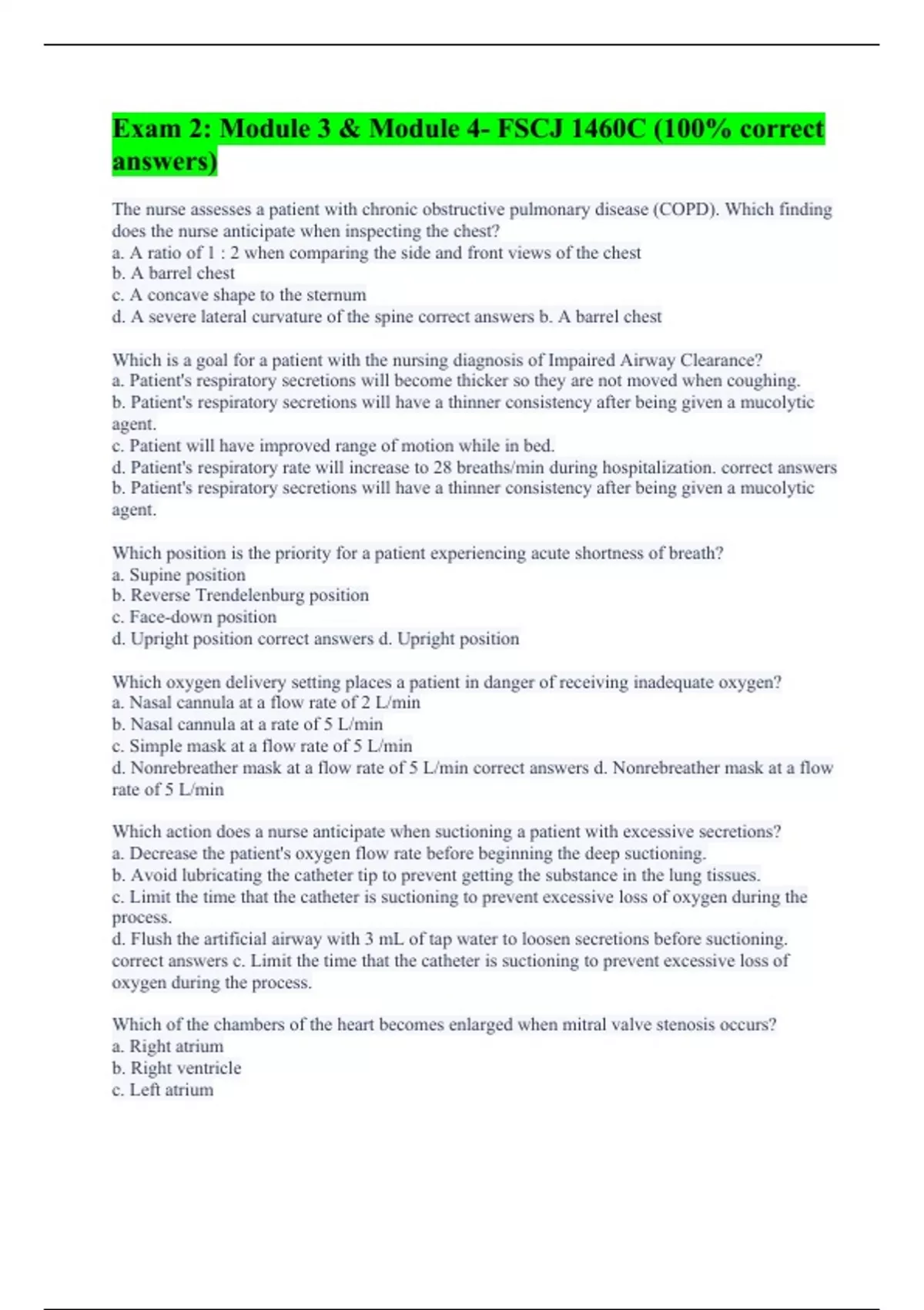 The nurse assesses a patient with chronic obstructive pulmonary disease (COPD). Which finding does the nurse anticipate when inspecting the chest? a. A ratio of 1 : 2 when comparing the side and front views of the chest b. A barrel chest c. A concave shape to the sternum d. A severe lateral curvature of the spine correct answers b. A barrel chest Which is a goal for a patient with the nursing diagnosis of Impaired Airway Clearance? a. Patient's respiratory secretions will become thicker so they are not moved when coughing. b. Patient's respiratory secretions will have a thinner consistency after being given a mucolytic agent. c. Patient will have improved range of motion while in bed. d. Patient's respiratory rate will increase to 28 breaths/min during hospitalization. correct answers b. Patient's respiratory secretions will have a thinner consistency after being given a mucolytic agent. Which position is the priority for a patient experiencing acute shortness of breath? a. Supine position b. Reverse Trendelenburg position c. Face-down position d. Upright position correct answers d. Upright position Which oxygen delivery setting places a patient in danger of receiving inadequate oxygen? a. Nasal cannula at a flow rate of 2 L/min b. Nasal cannula at a rate of 5 L/min c. Simple mask at a flow rate of 5 L/min d. Nonrebreather mask at a flow rate of 5 L/min correct answers d. Nonrebreather mask at a flow rate of 5 L/min Which action does a nurse anticipate when suctioning a patient with excessive secretions? a. Decrease the patient's oxygen flow rate before beginning the deep suctioning. b. Avoid lubricating the catheter tip to prevent getting the substance in the lung tissues. c. Limit the time that the catheter is suctioning to prevent excessive loss of oxygen during the process. d. Flush the artificial airway with 3 mL of tap water to loosen secretions before suctioning. correct answers c. Limit the time that the catheter is suctioning to prevent excessive loss of oxygen during the process. Which of the chambers of the heart becomes enlarged when mitral valve stenosis occurs? a. Right atrium b. Right ventricle c. Left atrium
