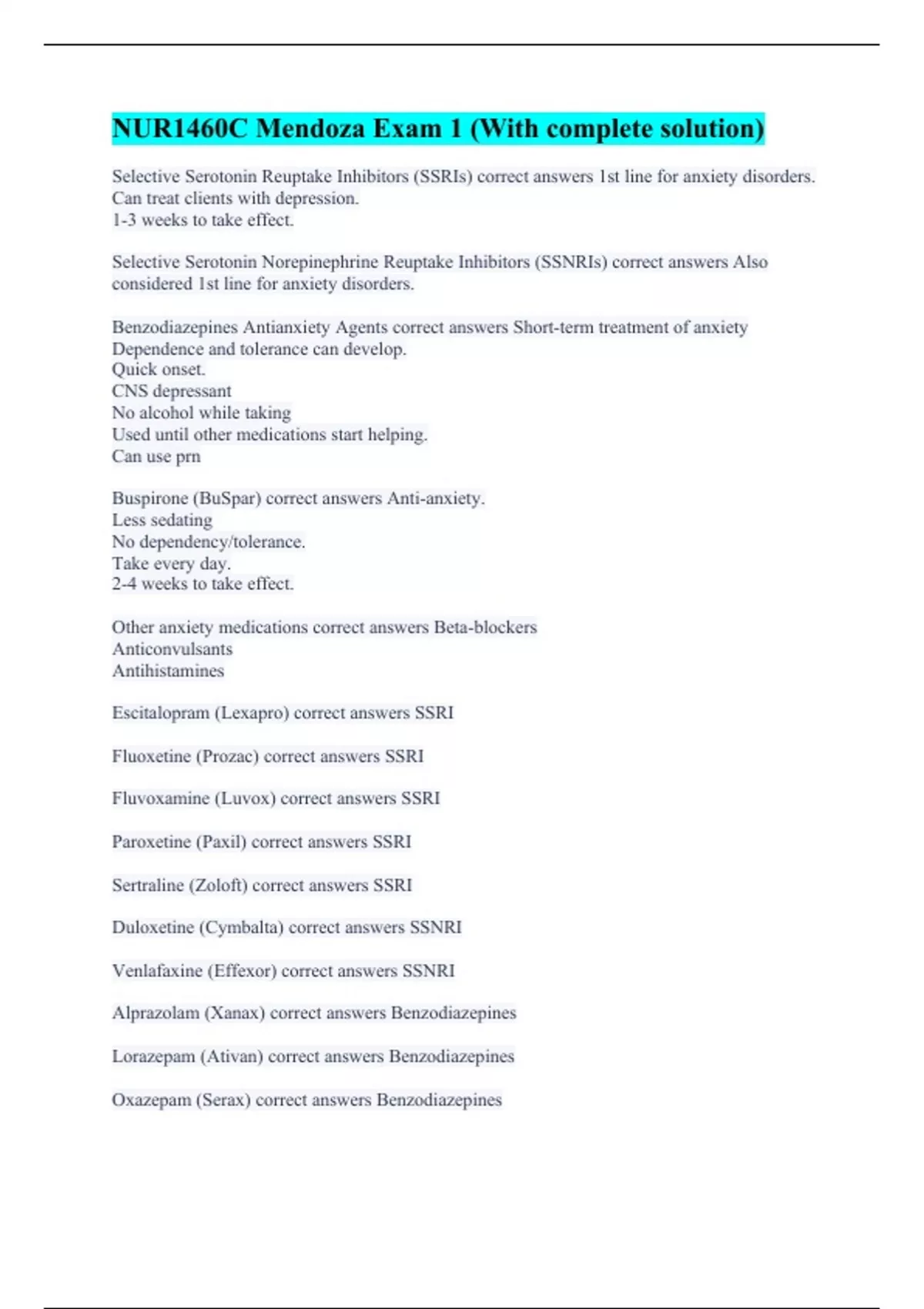 Selective Serotonin Reuptake Inhibitors (SSRIs) correct answers 1st line for anxiety disorders. Can treat clients with depression. 1-3 weeks to take effect. Selective Serotonin Norepinephrine Reuptake Inhibitors (SSNRIs) correct answers Also considered 1st line for anxiety disorders. Benzodiazepines Antianxiety Agents correct answers Short-term treatment of anxiety Dependence and tolerance can develop. Quick onset. CNS depressant No alcohol while taking Used until other medications start helping. Can use prn Buspirone (BuSpar) correct answers Anti-anxiety. Less sedating No dependency/tolerance. Take every day. 2-4 weeks to take effect. Other anxiety medications correct answers Beta-blockers Anticonvulsants Antihistamines Escitalopram (Lexapro) correct answers SSRI Fluoxetine (Prozac) correct answers SSRI Fluvoxamine (Luvox) correct answers SSRI Paroxetine (Paxil) correct answers SSRI Sertraline (Zoloft) correct answers SSRI Duloxetine (Cymbalta) correct answers SSNRI Venlafaxine (Effexor) correct answers SSNRI Alprazolam (Xanax) correct answers Benzodiazepines Lorazepam (Ativan) correct answers Benzodiazepines Oxazepam (Serax) correct answers Benzodiazepines