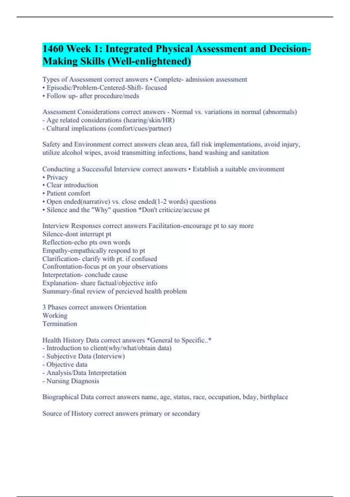 Types of Assessment correct answers • Complete- admission assessment • Episodic/Problem-Centered-Shift- focused • Follow up- after procedure/meds Assessment Considerations correct answers - Normal vs. variations in normal (abnormals) - Age related considerations (hearing/skin/HR) - Cultural implications (comfort/cues/partner) Safety and Environment correct answers clean area, fall risk implementations, avoid injury, utilize alcohol wipes, avoid transmitting infections, hand washing and sanitation Conducting a Successful Interview correct answers • Establish a suitable environment • Privacy • Clear introduction • Patient comfort • Open ended(narrative) vs. close ended(1-2 words) questions • Silence and the "Why" question *Don't criticize/accuse pt Interview Responses correct answers Facilitation-encourage pt to say more Silence-dont interrupt pt Reflection-echo pts own words Empathy-empathically respond to pt Clarification- clarify with pt. if confused Confrontation-focus pt on your observations Interpretation- conclude cause Explanation- share factual/objective info Summary-final review of percieved health problem 3 Phases correct answers Orientation Working Termination Health History Data correct answers *General to Specific..* - Introduction to client(why/what/obtain data) - Subjective Data (Interview) - Objective data - Analysis/Data Interpretation - Nursing Diagnosis Biographical Data correct answers name, age, status, race, occupation, bday, birthplace Source of History correct answers primary or secondary