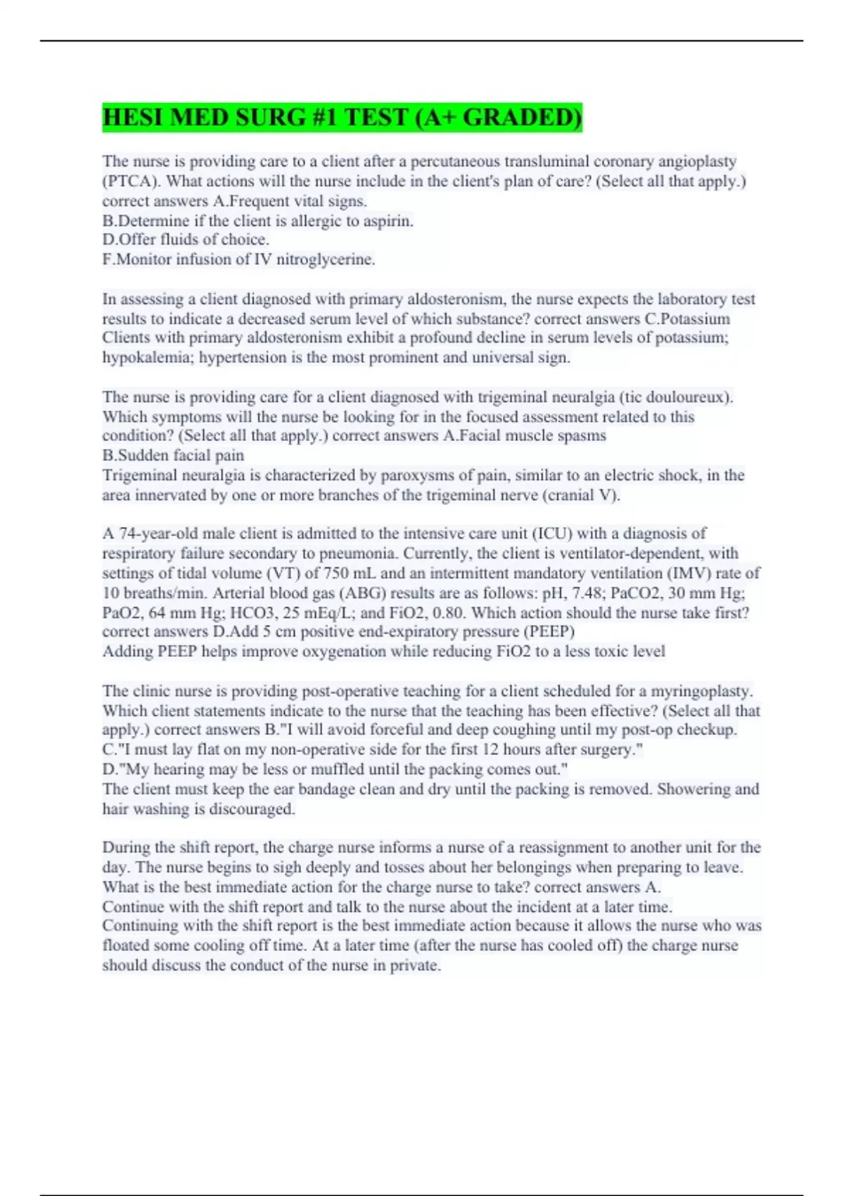 The nurse is providing care to a client after a percutaneous transluminal coronary angioplasty (PTCA). What actions will the nurse include in the client's plan of care? (Select all that apply.) correct answers A.Frequent vital signs. B.Determine if the client is allergic to aspirin. D.Offer fluids of choice. F.Monitor infusion of IV nitroglycerine. In assessing a client diagnosed with primary aldosteronism, the nurse expects the laboratory test results to indicate a decreased serum level of which substance? correct answers C.Potassium Clients with primary aldosteronism exhibit a profound decline in serum levels of potassium; hypokalemia; hypertension is the most prominent and universal sign. The nurse is providing care for a client diagnosed with trigeminal neuralgia (tic douloureux). Which symptoms will the nurse be looking for in the focused assessment related to this condition? (Select all that apply.) correct answers A.Facial muscle spasms B.Sudden facial pain Trigeminal neuralgia is characterized by paroxysms of pain, similar to an electric shock, in the area innervated by one or more branches of the trigeminal nerve (cranial V). A 74-year-old male client is admitted to the intensive care unit (ICU) with a diagnosis of respiratory failure secondary to pneumonia. Currently, the client is ventilator-dependent, with settings of tidal volume (VT) of 750 mL and an intermittent mandatory ventilation (IMV) rate of 10 breaths/min. Arterial blood gas (ABG) results are as follows: pH, 7.48; PaCO2, 30 mm Hg; PaO2, 64 mm Hg; HCO3, 25 mEq/L; and FiO2, 0.80. Which action should the nurse take first? correct answers D.Add 5 cm positive end-expiratory pressure (PEEP) Adding PEEP helps improve oxygenation while reducing FiO2 to a less toxic level The clinic nurse is providing post-operative teaching for a client scheduled for a myringoplasty. Which client statements indicate to the nurse that the teaching has been effective? (Select all that apply.) correct answers B."I will avoid forceful and deep coughing until my post-op checkup. C."I must lay flat on my non-operative side for the first 12 hours after surgery." D."My hearing may be less or muffled until the packing comes out." The client must keep the ear bandage clean and dry until the packing is removed. Showering and hair washing is discouraged. During the shift report, the charge nurse informs a nurse of a reassignment to another unit for the day. The nurse begins to sigh deeply and tosses about her belongings when preparing to leave. What is the best immediate action for the charge nurse to take? correct answers A. Continue with the shift report and talk to the nurse about the incident at a later time. Continuing with the shift report is the best immediate action because it allows the nurse who was floated some cooling off time. At a later time (after the nurse has cooled off) the charge nurse should discuss the conduct of the nurse in private.