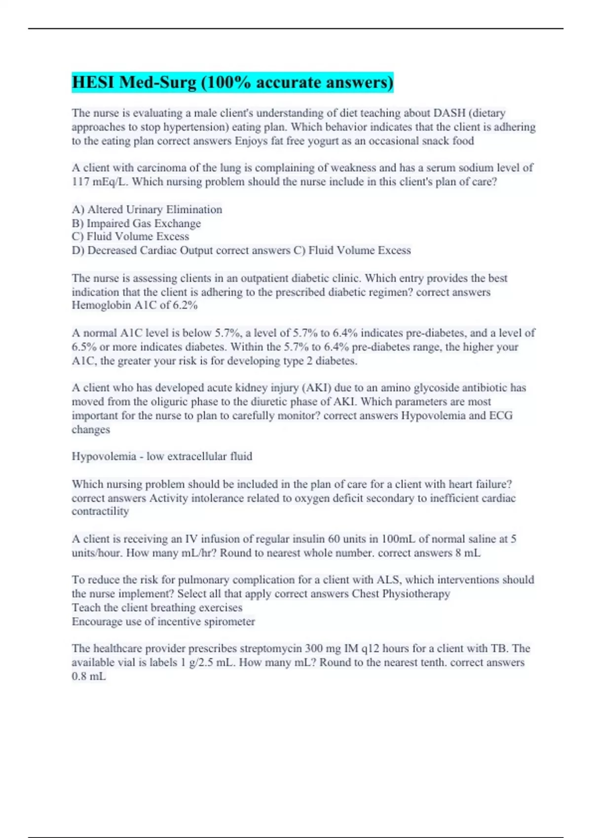 The nurse is evaluating a male client's understanding of diet teaching about DASH (dietary approaches to stop hypertension) eating plan. Which behavior indicates that the client is adhering to the eating plan correct answers Enjoys fat free yogurt as an occasional snack food A client with carcinoma of the lung is complaining of weakness and has a serum sodium level of 117 mEq/L. Which nursing problem should the nurse include in this client's plan of care? A) Altered Urinary Elimination B) Impaired Gas Exchange C) Fluid Volume Excess D) Decreased Cardiac Output correct answers C) Fluid Volume Excess The nurse is assessing clients in an outpatient diabetic clinic. Which entry provides the best indication that the client is adhering to the prescribed diabetic regimen? correct answers Hemoglobin A1C of 6.2% A normal A1C level is below 5.7%, a level of 5.7% to 6.4% indicates pre-diabetes, and a level of 6.5% or more indicates diabetes. Within the 5.7% to 6.4% pre-diabetes range, the higher your A1C, the greater your risk is for developing type 2 diabetes. A client who has developed acute kidney injury (AKI) due to an amino glycoside antibiotic has moved from the oliguric phase to the diuretic phase of AKI. Which parameters are most important for the nurse to plan to carefully monitor? correct answers Hypovolemia and ECG changes Hypovolemia - low extracellular fluid Which nursing problem should be included in the plan of care for a client with heart failure? correct answers Activity intolerance related to oxygen deficit secondary to inefficient cardiac contractility A client is receiving an IV infusion of regular insulin 60 units in 100mL of normal saline at 5 units/hour. How many mL/hr? Round to nearest whole number. correct answers 8 mL To reduce the risk for pulmonary complication for a client with ALS, which interventions should the nurse implement? Select all that apply correct answers Chest Physiotherapy Teach the client breathing exercises Encourage use of incentive spirometer The healthcare provider prescribes streptomycin 300 mg IM q12 hours for a client with TB. The available vial is labels 1 g/2.5 mL. How many mL? Round to the nearest tenth. correct answers 0.8 mL
