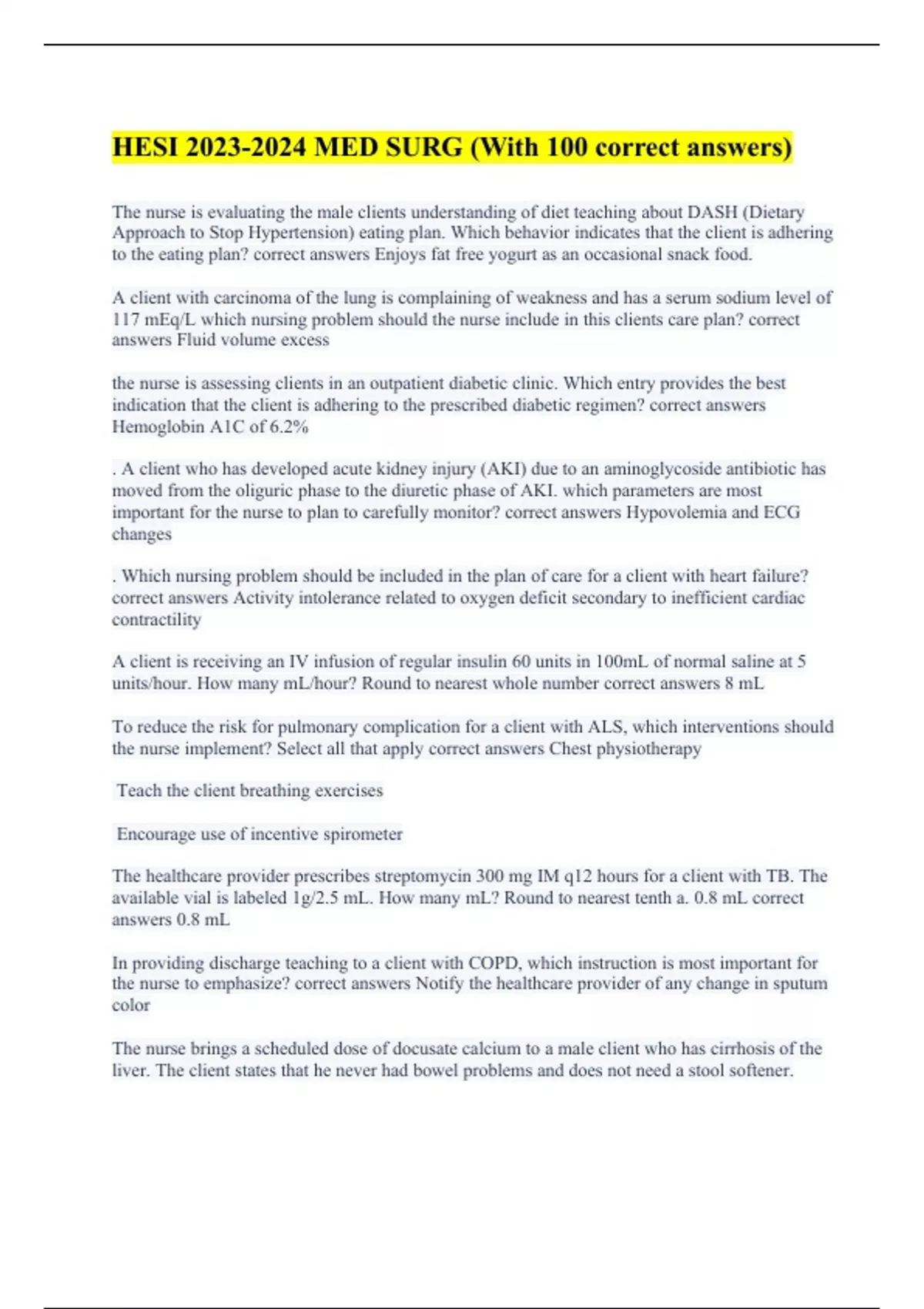 The nurse is evaluating the male clients understanding of diet teaching about DASH (Dietary Approach to Stop Hypertension) eating plan. Which behavior indicates that the client is adhering to the eating plan? correct answers Enjoys fat free yogurt as an occasional snack food. A client with carcinoma of the lung is complaining of weakness and has a serum sodium level of 117 mEq/L which nursing problem should the nurse include in this clients care plan? correct answers Fluid volume excess the nurse is assessing clients in an outpatient diabetic clinic. Which entry provides the best indication that the client is adhering to the prescribed diabetic regimen? correct answers Hemoglobin A1C of 6.2% . A client who has developed acute kidney injury (AKI) due to an aminoglycoside antibiotic has moved from the oliguric phase to the diuretic phase of AKI. which parameters are most important for the nurse to plan to carefully monitor? correct answers Hypovolemia and ECG changes . Which nursing problem should be included in the plan of care for a client with heart failure? correct answers Activity intolerance related to oxygen deficit secondary to inefficient cardiac contractility A client is receiving an IV infusion of regular insulin 60 units in 100mL of normal saline at 5 units/hour. How many mL/hour? Round to nearest whole number correct answers 8 mL To reduce the risk for pulmonary complication for a client with ALS, which interventions should the nurse implement? Select all that apply correct answers Chest physiotherapy Teach the client breathing exercises Encourage use of incentive spirometer The healthcare provider prescribes streptomycin 300 mg IM q12 hours for a client with TB. The available vial is labeled 1g/2.5 mL. How many mL? Round to nearest tenth a. 0.8 mL correct answers 0.8 mL In providing discharge teaching to a client with COPD, which instruction is most important for the nurse to emphasize? correct answers Notify the healthcare provider of any change in sputum color The nurse brings a scheduled dose of docusate calcium to a male client who has cirrhosis of the liver. The client states that he never had bowel problems and does not need a stool softener.