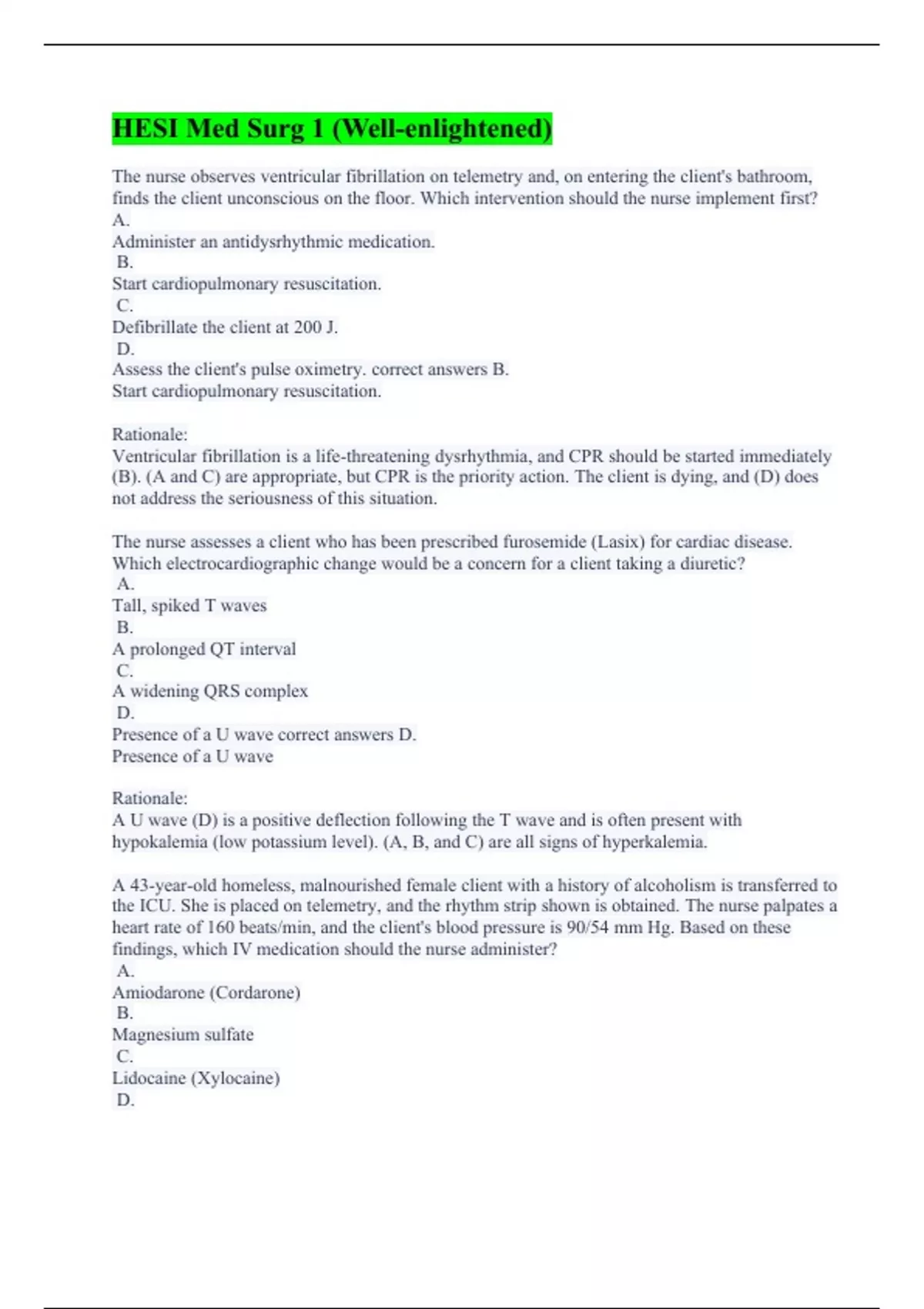 The nurse observes ventricular fibrillation on telemetry and, on entering the client's bathroom, finds the client unconscious on the floor. Which intervention should the nurse implement first? A. Administer an antidysrhythmic medication. B. Start cardiopulmonary resuscitation. C. Defibrillate the client at 200 J. D. Assess the client's pulse oximetry. correct answers B. Start cardiopulmonary resuscitation. Rationale: Ventricular fibrillation is a life-threatening dysrhythmia, and CPR should be started immediately (B). (A and C) are appropriate, but CPR is the priority action. The client is dying, and (D) does not address the seriousness of this situation. The nurse assesses a client who has been prescribed furosemide (Lasix) for cardiac disease. Which electrocardiographic change would be a concern for a client taking a diuretic? A. Tall, spiked T waves B. A prolonged QT interval C. A widening QRS complex D. Presence of a U wave correct answers D. Presence of a U wave Rationale: A U wave (D) is a positive deflection following the T wave and is often present with hypokalemia (low potassium level). (A, B, and C) are all signs of hyperkalemia. A 43-year-old homeless, malnourished female client with a history of alcoholism is transferred to the ICU. She is placed on telemetry, and the rhythm strip shown is obtained. The nurse palpates a heart rate of 160 beats/min, and the client's blood pressure is 90/54 mm Hg. Based on these findings, which IV medication should the nurse administer? A. Amiodarone (Cordarone) B. Magnesium sulfate C. Lidocaine (Xylocaine) D.