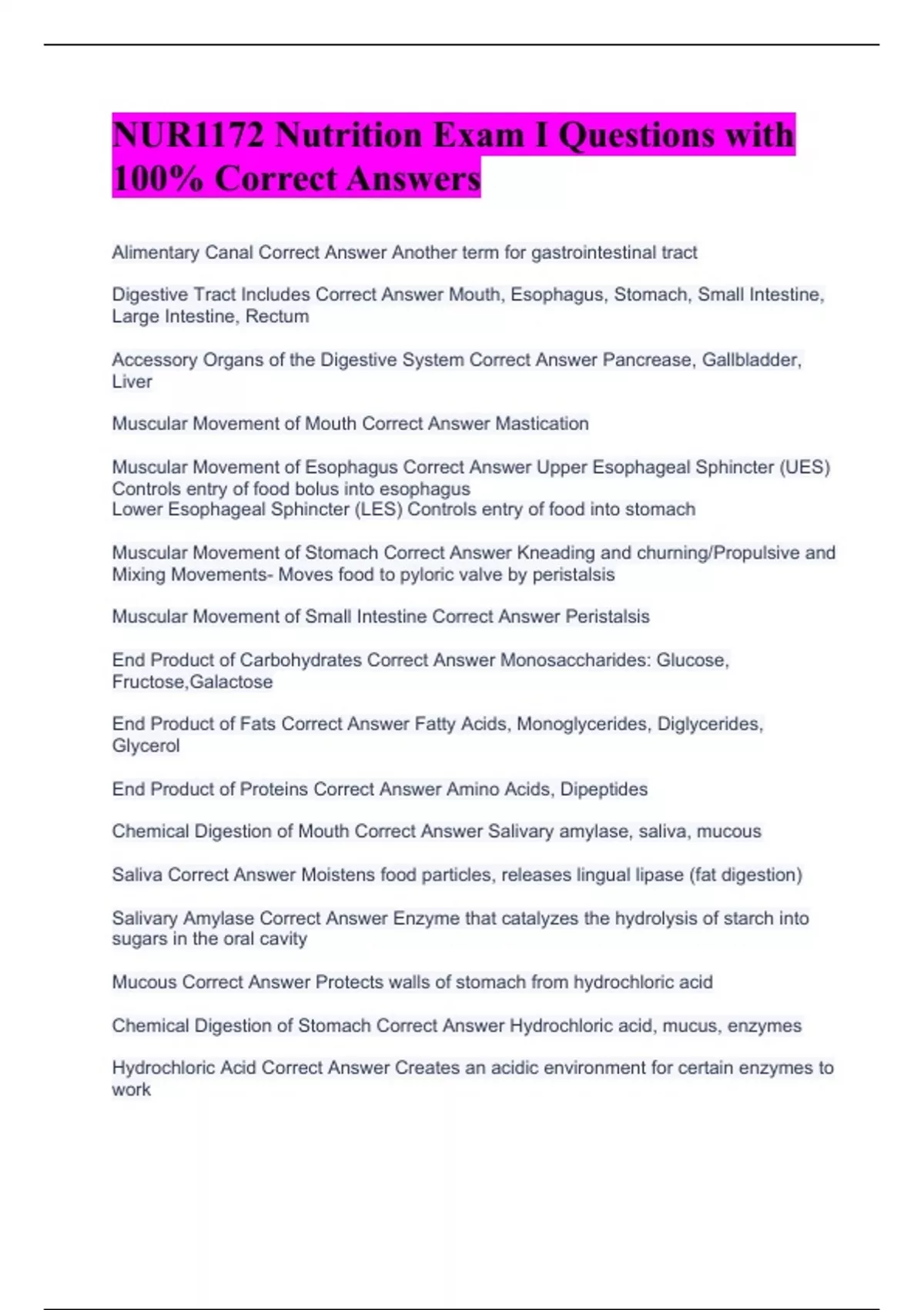 NUR1172 Nutrition Exam I Questions with 100% Correct Answers