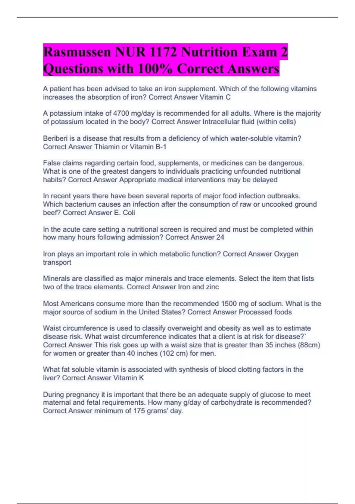 Rasmussen NUR 1172 Nutrition Exam 2 Questions with 100% Correct Answers