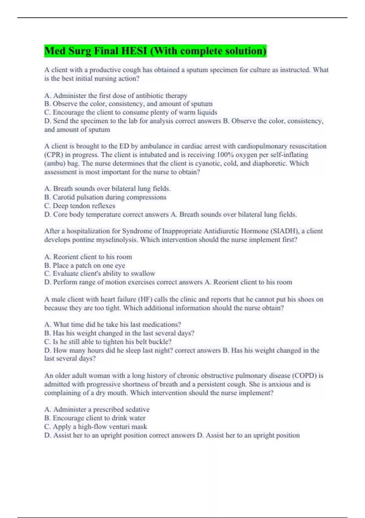 A client with a productive cough has obtained a sputum specimen for culture as instructed. What is the best initial nursing action? A. Administer the first dose of antibiotic therapy B. Observe the color, consistency, and amount of sputum C. Encourage the client to consume plenty of warm liquids D. Send the specimen to the lab for analysis correct answers B. Observe the color, consistency, and amount of sputum A client is brought to the ED by ambulance in cardiac arrest with cardiopulmonary resuscitation (CPR) in progress. The client is intubated and is receiving 100% oxygen per self-inflating (ambu) bag. The nurse determines that the client is cyanotic, cold, and diaphoretic. Which assessment is most important for the nurse to obtain? A. Breath sounds over bilateral lung fields. B. Carotid pulsation during compressions C. Deep tendon reflexes D. Core body temperature correct answers A. Breath sounds over bilateral lung fields. After a hospitalization for Syndrome of Inappropriate Antidiuretic Hormone (SIADH), a client develops pontine myselinolysis. Which intervention should the nurse implement first? A. Reorient client to his room B. Place a patch on one eye C. Evaluate client's ability to swallow D. Perform range of motion exercises correct answers A. Reorient client to his room A male client with heart failure (HF) calls the clinic and reports that he cannot put his shoes on because they are too tight. Which additional information should the nurse obtain? A. What time did he take his last medications? B. Has his weight changed in the last several days? C. Is he still able to tighten his belt buckle? D. How many hours did he sleep last night? correct answers B. Has his weight changed in the last several days? An older adult woman with a long history of chronic obstructive pulmonary disease (COPD) is admitted with progressive shortness of breath and a persistent cough. She is anxious and is complaining of a dry mouth. Which intervention should the nurse implement? A. Administer a prescribed sedative B. Encourage client to drink water C. Apply a high-flow venturi mask D. Assist her to an upright position correct answers D. Assist her to an upright position