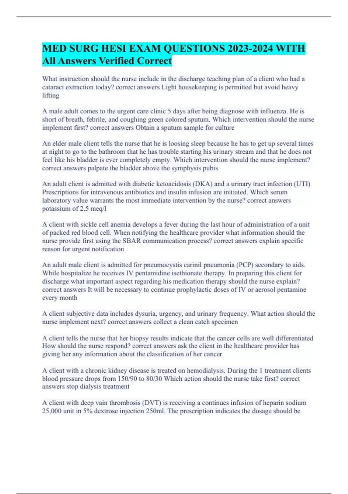 MED SURG HESI EXAM QUESTIONS WITH All Answers Verified Correct
