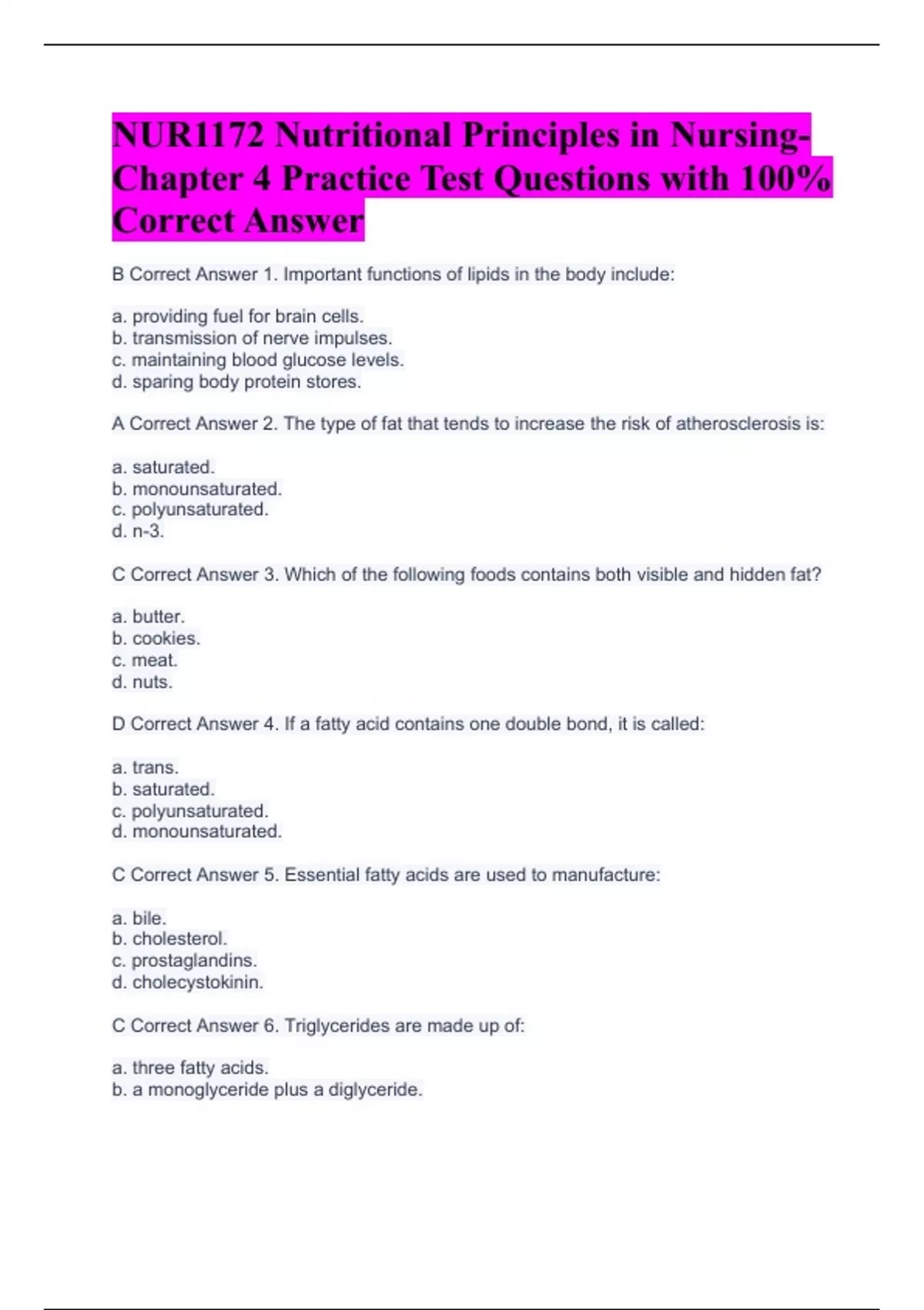 B Correct Answer 1. Important functions of lipids in the body include: a. providing fuel for brain cells. b. transmission of nerve impulses. c. maintaining blood glucose levels. d. sparing body protein stores. A Correct Answer 2. The type of fat that tends to increase the risk of atherosclerosis is: a. saturated. b. monounsaturated. c. polyunsaturated. d. n-3. C Correct Answer 3. Which of the following foods contains both visible and hidden fat? a. butter. b. cookies. c. meat. d. nuts. D Correct Answer 4. If a fatty acid contains one double bond, it is called: a. trans. b. saturated. c. polyunsaturated. d. monounsaturated. C Correct Answer 5. Essential fatty acids are used to manufacture: a. bile. b. cholesterol. c. prostaglandins. d. cholecystokinin.