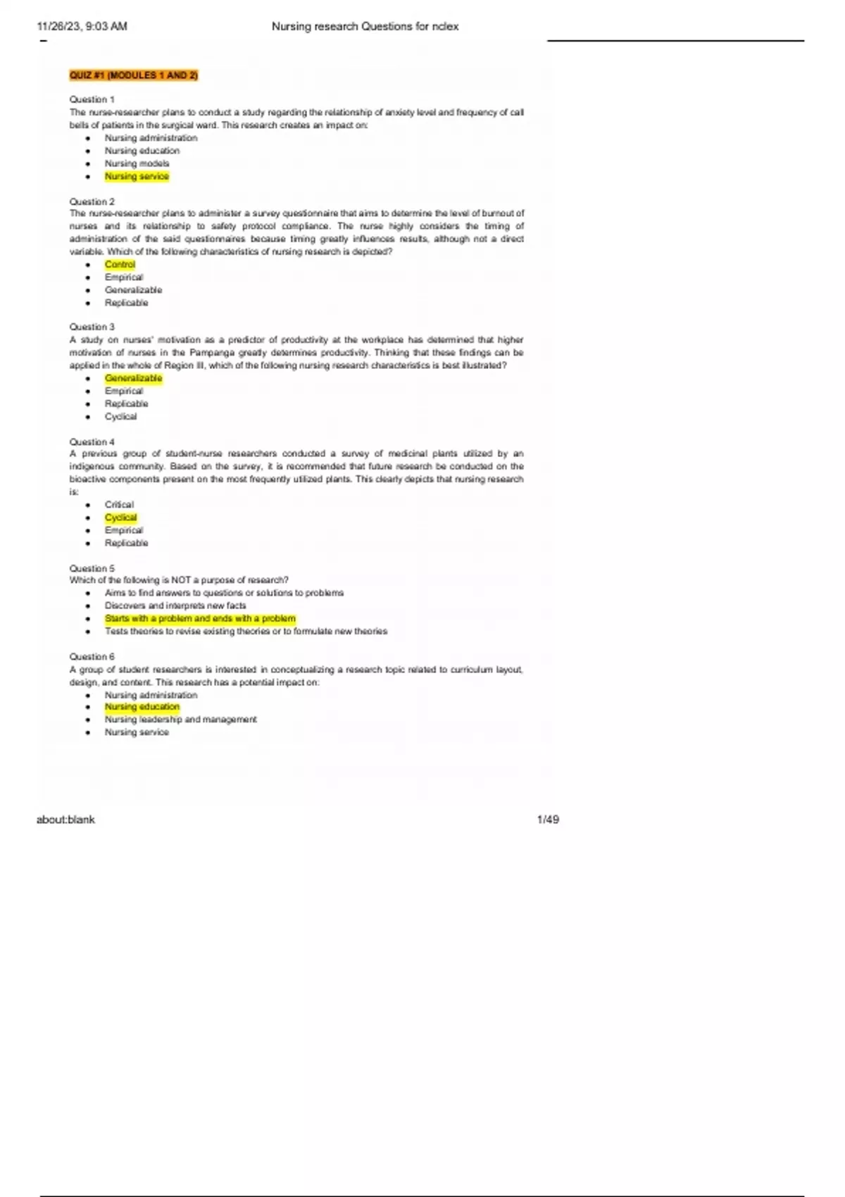 , 11/26/23, 9:03 AM Nursing research Questions for nclex