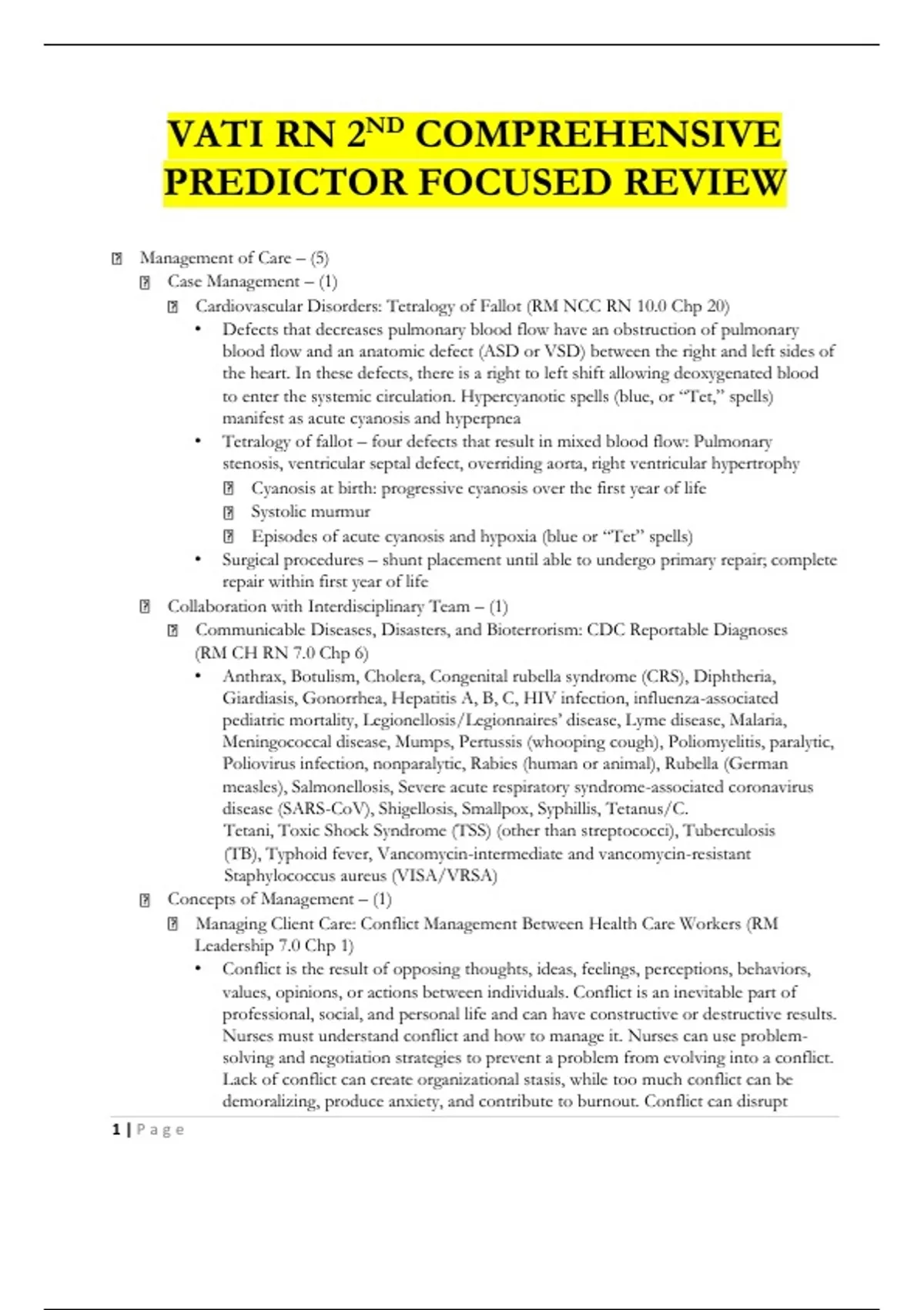 VATI RN 2ND COMPREHENSIVE PREDICTOR FOCUSED REVIEWManagement of Care – (5) Case Management – (1) Cardiovascular Disorders: Tetralogy of Fallot (RM NCC RN 10.0 Chp 20) • Defects that decreases pulmonary blood flow have an obstruction of pulmonary blood flow and an anatomic defect (ASD or VSD) between the right and left sides of the heart. In these defects, there is a right to left shift allowing deoxygenated blood to enter the systemic circulation. Hypercyanotic spells (blue, or “Tet,” spells) manifest as acute cyanosis and hyperpnea • Tetralogy of fallot – four defects that result in mixed blood flow: Pulmonary stenosis, ventricular septal defect, overriding aorta, right ventricular hypertrophy Cyanosis at birth: progressive cyanosis over the first year of life Systolic murmur Episodes of acute cyanosis and hypoxia (blue or “Tet” spells) • Surgical procedures – shunt placement until able to undergo primary repair; complete repair within first year of life Collaboration with Interdisciplinary Team – (1) Communicable Diseases, Disasters, and Bioterrorism: CDC Reportable Diagnoses (RM CH RN 7.0 Chp 6) • Anthrax, Botulism, Cholera, Congenital rubella syndrome (CRS), Diphtheria, Giardiasis, Gonorrhea, Hepatitis A, B, C, HIV infection, influenza-associated pediatric mortality, Legionellosis/Legionnaires’ disease, Lyme disease, Malaria, Meningococcal disease, Mumps, Pertussis (whooping cough), Poliomyelitis, paralytic, Poliovirus infection, nonparalytic, Rabies (human or animal), Rubella (German measles), Salmonellosis, Severe acute respiratory syndrome-associated coronavirus disease (SARS-CoV), Shigellosis, Smallpox, Syphillis, Tetanus/C. Tetani, Toxic Shock Syndrome (TSS) (other than streptococci), Tuberculosis (TB), Typhoid fever, Vancomycin-intermediate and vancomycin-resistant Staphylococcus aureus (VISA/VRSA) Concepts of Management – (1) Managing Client Care: Conflict Management Between Health Care Workers (RM Leadership 7.0 Chp 1) • Conflict is the result of opposing thoughts, ideas, feelings, perceptions, behaviors, values, opinions, or actions between individuals. Conflict is an inevitable part of professional, social, and personal life and can have constructive or destructive results. Nurses must understand conflict and how to manage it. Nurses can use problemsolving and negotiation strategies to prevent a problem from evolving into a conflict. Lack of conflict can create organizational stasis, while too much conflict can be demoralizing, produce anxiety, and contribute to burnout. Conflict can disrupt 1 | P a g eworking relationships and create a stressful atmosphere. If conflict exists to the level that productivity and quality of care are compromised, the unit manager must attempt to identify the origin of the conflict and attempt to resolve it. Continuity of Care – (1) Information Technology: Change-of-Shift Report (RM FUND 9.0 Chp 5) • Nurses give this report at the conclusion of each shift ot the nurse assuming responsibility for the clients. Formats include face to face, audiotaping, or presentation during walking rounds in each client’s room (unless the client has a roommate or visitors are present). An effective report should: include significant objective information about the client’s health problems, proceed in a logical sequence, include no gossip or personal opinion, and relate recent changes in medications, treatments, procedures, and the discharge plan. Establishing Priorities – (1) Managing Client Care: Prioritizing Care of Postoperative Clients (RM Leadership 7.0 Chp 1) • Prioritize systemic before local (“life before limb”) • Prioritize acute (less opportunity for physical adaptation) before chronic (greater opportunity for physical adaptation) • Prioritize actual problems before potential future problems • Listen carefully to clients and don’t assume • Recognize and respond to trends vs. transient findings • Recognize indications of medical emergencies and complications vs. expected findings • Apply clinical knowledge to procedural standards to determine the priority actions Safety and Infection Control – (8) Accident/Error/Injury Prevention – (1) Seizures: Maintaining Seizure Precautions (RM NCC RN 10.0 Chp 13) • Maintain seizure precautions, including placing the bed in the lowest position and padding the side rails to prevent future injury. Emergency Response Plan – (1) Client Safety: Priority Action for Fire (RM FUND 9.0 Chp 12) • R: rescue and protect clients in close proximity to the fire by moving them to a safer location. Clients who are ambulatory may walk independently in a safe location • A: alarm: activate the facility’s alarm system and then report the fire’s details and location • C: contain/confine the fire by closing doors and windows and turning off any sources of oxygen and any electrical devices. Ventilate clients who are on life support with a bag valve mask • E: extinguish the fire is possible using the appropriate fire extinguisher Handling Hazardous and Infectious Materials – (1) Cancer Treatment Options: Implanted Internal Radiation Device (RM AMS RN 10.0 Chp 91)• Brachytherapy describes internal radiation that is placed close to the target tissue. This is done via placement in a body orifice (vagina) or body cavity (abdomen) or delivered via IV such as with radionuclide iodine, which is absorbed by the thyroid. Brachytherapy provides radiation to the tumor and a limited amount to surrounding normal tissues. Waste products are radioactive until the isotope has been completely eliminated from the body. Waste products should not be touched by anyone. Nursing considerations: Place the client in a private room away from other clients when possible. Keep door closed as much as possible. Place a sign on the door warning of the radiation source. Wear a dosimeter film badge that records personal amount of radiation exposure. Limit visitors to 30-min visits, and hav