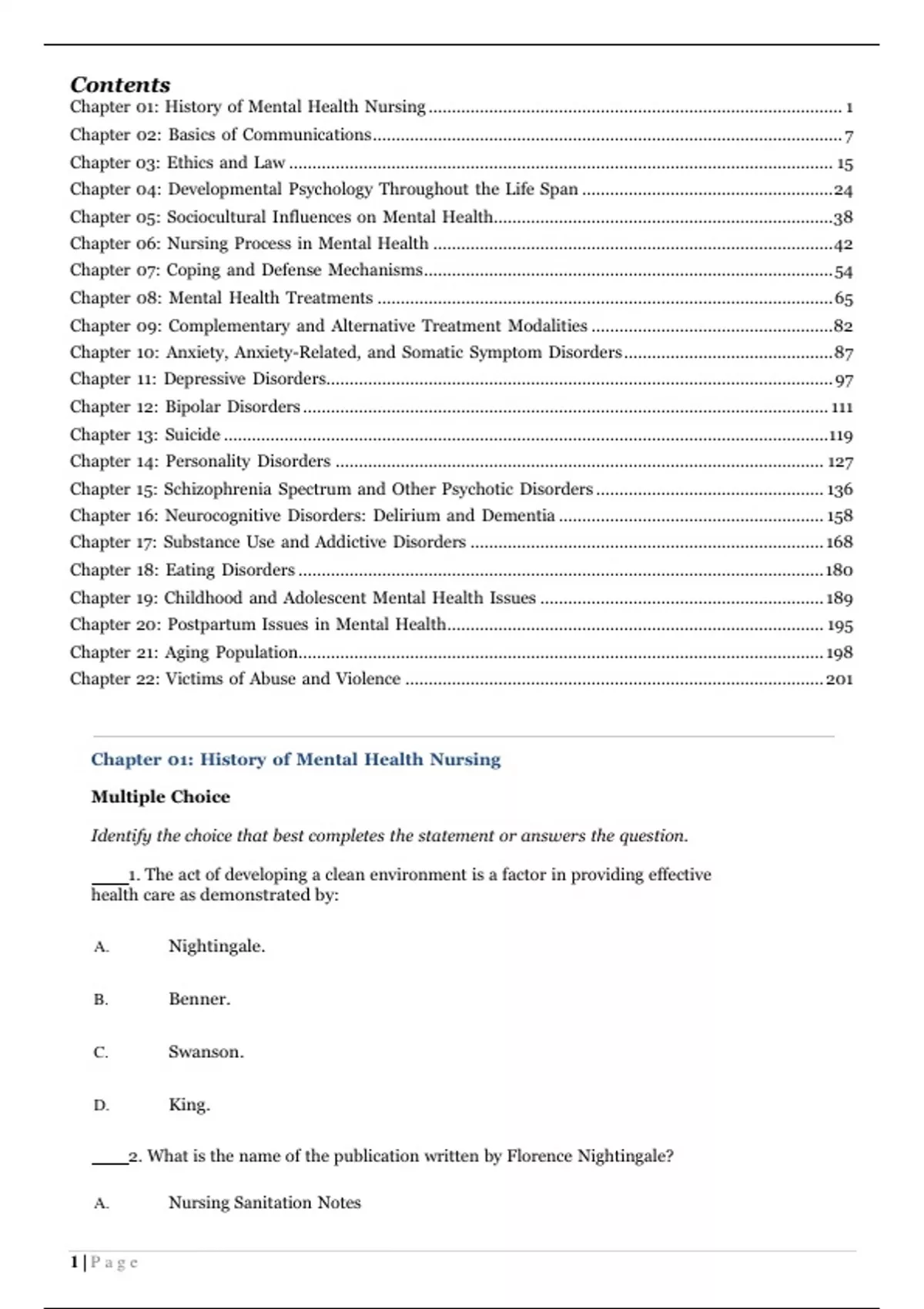 Test Bank Neeb's Mental Health Nursing (5e by Gorman and Anwar) Contents Chapter 01: History of Mental Health Nursing ......................................................................................... 1 Chapter 02: Basics of Communications ..................................................................................................... 7 Chapter 03: Ethics and Law ..................................................................................................................... 15 Chapter 04: Developmental Psychology Throughout the Life Span ...................................................... 24 Chapter 05: Sociocultural Influences on Mental Health......................................................................... 38 Chapter 06: Nursing Process in Mental Health ...................................................................................... 42 Chapter 07: Coping and Defense Mechanisms ........................................................................................ 54 Chapter 08: Mental Health Treatments .................................................................................................. 65 Chapter 09: Complementary and Alternative Treatment Modalities .................................................... 82 Chapter 10: Anxiety, Anxiety-Related, and Somatic Symptom Disorders ............................................. 87 Chapter 11: Depressive Disorders............................................................................................................. 97 Chapter 12: Bipolar Disorders ................................................................................................................. 111 Chapter 13: Suicide .................................................................................................................................. 119 Chapter 14: Personality Disorders ......................................................................................................... 127 Chapter 15: Schizophrenia Spectrum and Other Psychotic Disorders ................................................. 136 Chapter 16: Neurocognitive Disorders: Delirium and Dementia ......................................................... 158 Chapter 17: Substance Use and Addictive Disorders ............................................................................ 168 Chapter 18: Eating Disorders ................................................................................................................. 180 Chapter 19: Childhood and Adolescent Mental Health Issues ............................................................. 189 Chapter 20: Postpartum Issues in Mental Health ................................................................................. 195 Chapter 21: Aging Population................................................................................................................. 198 Chapter 22: Victims of Abuse and Violence .......................................................................................... 201 Chapter 01: History of Mental Health Nursing Multiple Choice Identify the choice that best completes the statement or answers the question. 1. The act of developing a clean environment is a factor in providing effective health care as demonstrated by: A. Nightingale. B. C. D. Benner. Swanson. King. 2. What is the name of the publication written by Florence Nightingale? A. 1 | P a g e Nursing Sanitation NotesB. C. D. Nursing 101 Notes on Nursing Nursing Notes 3. A long-term goal for in-patient mental health treatment is generally to: A. B. C. D. Return the patient to the community. Locate a facility for long term care. Be arrested and placed in prison. Be completely cured of the disorder. 4. The mentally ill were once housed in mental institutions known as: A. B. C. D. patient? A. B. C. D. Hospitals. Long-term care facilities. Asylums. Free-standing treatment centers. 5. Which nursing theorists promoted the interpersonal theory between the nurse and the Hildegard Peplau Hattie Bessent Mary Mahoney Linda Richards Completion Complete each statement. 6. Phenothiazines were discovered in what year? . 7. The first psychiatric program of study was established by which nursing leader? 8. Who was the nurse theorist who was the first American-trained nurse credited with teaching how to provide care for people with mental illness? 9. The greatest advance in the early years of mental health care was the introduction of 2 | P a g e. 10. The legislation that provided funding for improving the care of the mentally ill is known as the National Mental Health Act of what year? . 11. Which nursing organization established the first certification of psychiatric nursing? 12. One of the goals of the American Nurses Association (ANA) is to promote nursing care in the United States. 13. has always been called the founder of nursing. 14. A schoolteacher by the name of established asylums and a psychiatric hospital for the mentally ill. 15. Special facilities designed to care for the mentally ill in the past were known as 16. The first psychotropic drug category was known as . 17. Each state adopts its own set of rules and guidelines that govern the nurses performance. These rules are known as the Practice Act. 18. The first major federal law to address mental illness was called the Act. Multiple Response Identify one or more choices that best complete the statement or answer the question. 19. What trends contributed to the deinstitutionalization of mental health facilities to outpatient care (select all that apply): A. Cost of the facilities. B. C. D. The increased use of phenothiazines. Staff cost. Establishment of Outpatient clinics. Chapter 1: History of Mental Health Nursing Answer Section MULTIPLE CHOICE 1. ANS: A Florence Nightingales commitments to improved outcomes at a military hospital were directly related to introducing sanitation methods. PTS: 1 KEY: Integrated Processes: Teaching/Learning | Content Area: Community