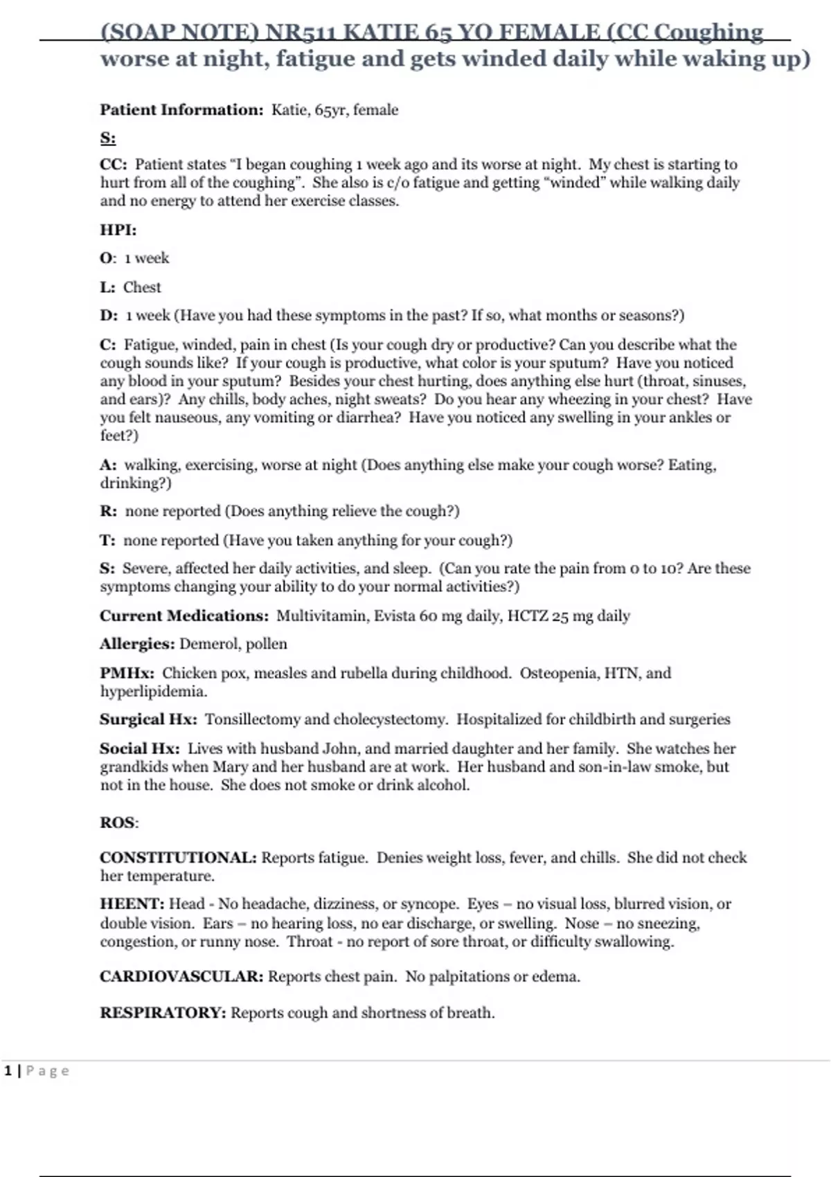 CC: Patient states “I began coughing 1 week ago and its worse at night. My chest is starting to
