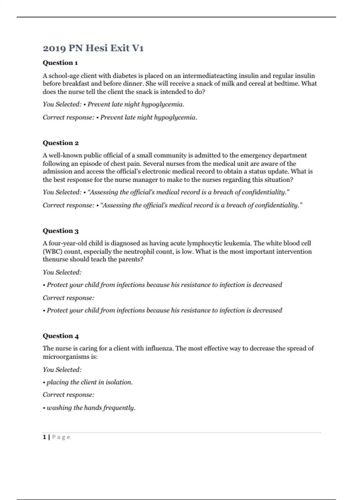 2019 PN Hesi Exit V1Question 1 A school-age client with diabetes is placed on an intermediateacting insulin and regular insulin before breakfast and before dinner. She will receive a snack of milk and cereal at bedtime. What does the nurse tell the client the snack is intended to do? You Selected: • Prevent late night hypoglycemia. Correct response: • Prevent late night hypoglycemia. Question 2 A well-known public official of a small community is admitted to the emergency department following an episode of chest pain. Several nurses from the medical unit are aware of the admission and access the official’s electronic medical record to obtain a status update. What is the best response for the nurse manager to make to the nurses regarding this situation? You Selected: • “Assessing the official’s medical record is a breach of confidentiality.” Correct response: • “Assessing the official’s medical record is a breach of confidentiality.” Question 3 A four-year-old child is diagnosed as having acute lymphocytic leukemia. The white blood cell (WBC) count, especially the neutrophil count, is low. What is the most important intervention thenurse should teach the parents? You Selected: • Protect your child from infections because his resistance to infection is decreased Correct response: • Protect your child from infections because his resistance to infection is decreased Question 4 The nurse is caring for a client with influenza. The most effective way to decrease the spread of microorganisms is: You Selected: • placing the client in isolation. Correct response: • washing the hands frequently. 1 | P a g eQuestion 5 A client with a history of hypertension has been prescribed a new antihypertensive medication and is reporting dizziness. Which is the best way for the nurse to assess blood pressure? You Selected: • in the supine, sitting, and standing positions Correct response: • in the supine, sitting, and standing positions Question 6 A client has a soft wrist-safety device. Which assessment finding should the nurse investigate further? You Selected: • cool, pale fingers Correct response: • cool, pale fingers Question 7 A nurse is caring for a female client before surgery. The client states that she is glad that she will not be going through menopause as a result of her surgery and is only having her uterus removed. The nurse reviews the consent form and notes that the surgery is for a total abdominal hysterectomy with a salpingo-oophorectomy. What should the nurse do in this situation? You Selected: • Contact the surgeon to explain that the client needs further clarification regarding surgery. Correct response: • Contact the surgeon to explain that the client needs further clarification regarding surgery. Question 8 A young client diagnosed with schizophrenia is talking with the nurse and says, "You know, when I thought everyone was out to get me, I was staying in my apartment all the time. Now, I would like to get out and do things again." What is the best initial response by the nurse? You Selected: • "What activities did you enjoy in the past?" Correct response: 2 | P a g e• "What activities did you enjoy in the past?" Question 9 A client with anemia has been admitted to the medical-surgical unit. Which assessment findings are characteristic of iron deficiency anemia? You Selected: • nausea, vomiting, and anorexia Correct response: • dyspnea, tachycardia, and pallor Question 10 The nurse is discontinuing an intravenous catheter on a 10-year-old client with hemophilia. What would be the most important intervention for this client? You Selected: • Apply firm pressure on the site for 5 minutes after removal. Correct response: • Apply firm pressure on the site for 5 minutes after removal. Question 11 When a client returns from the recovery room postmastectomy, an initial postoperative assessment is performed by the nurse. What is the nurse’s priority assessment? You Selected: • checking the dressing, drain, and amount of drainage Correct response: • assessing the vital signs and oxygen saturation levels Question 12 A client with an uncomplicated term pregnancy arrives at the labor- and-delivery unit in early labor saying that she thinks her water has broken. What is the nurse’s best action? You Selected: • Ask what time this happened and note the color, amount, and odor of the fluid. Correct response: 3 | P a g e• Ask what time this happened and note the color, amount, and odor of the fluid. Question 13 When documenting the care of a client, the nurse is aware of the need to use abbreviations conscientiously and safely. This includes: You Selected: • ensuring the abbreviations are understandable to clients who may seek access to their health records Correct response: • limiting abbreviations to those approved for use by the institution Question 14 During routine prenatal screening, a nurse tells a client that her blood sample will be used for alpha fetoprotein (AFP) testing. Which statement best describes what AFP testing indicates? You Selected: • "This screening indicates if your baby's lungs are mature." Correct response: • "This test will screen for spina bifida, Down syndrome, or other genetic defects." Question 15 A client is recovering from an infected abdominal wound. Which foods should the nurse encourage the client to eat to support wound healing and recovery from the infection? You Selected: • chicken and orange slices Correct response: • chicken and orange slices Question 16 A nurse suspects that the laboring client may have been physically abused by her partner. What is the most appropriate intervention by 4 | P a g ethe nurse? You Selected: • Collaborate with the interprofessional team to make a referral to social services. Correct response: • Collaborate with the interprofessional team to make a referral to social services. Question 17 A client is newly diagnosed with asthma. While learning to use a me