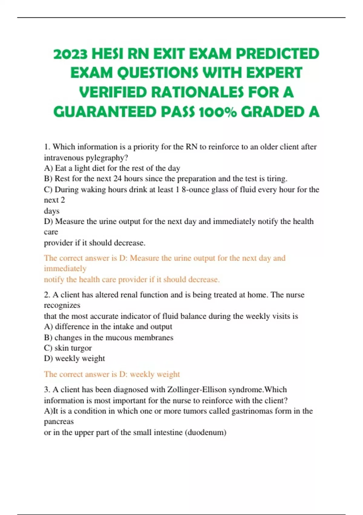 2023 HESI RN EXIT EXAM PREDICTED EXAM QUESTIONS WITH EXPERT VERIFIED RATIONALES FOR A GUARANTEED PASS 100% GRADED A