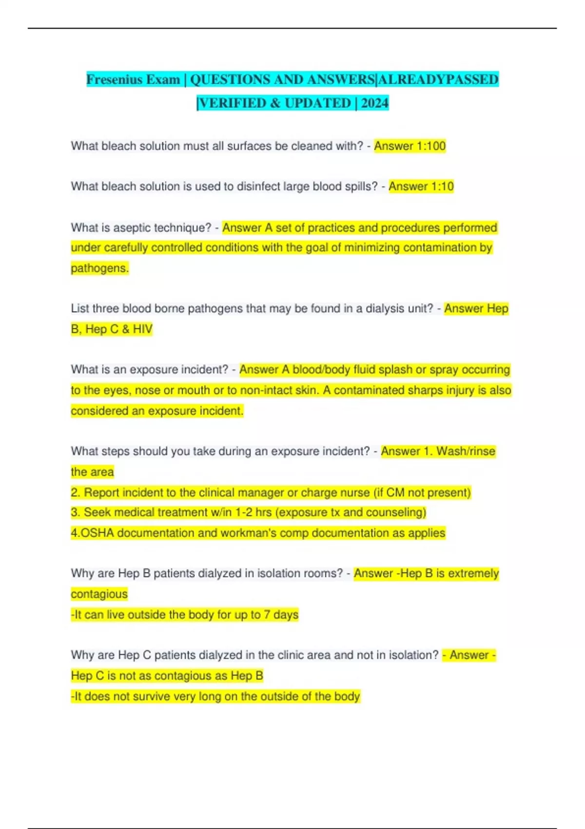 Fresenius Exam | QUESTIONS AND ANSWERS|ALREADYPASSED |VERIFIED & UPDATED | 2024 What bleach solution must all surfaces be cleaned with? - Answer 1:100 What bleach solution is used to disinfect large blood spills? - Answer 1:10 What is aseptic technique? - Answer A set of practices and procedures performed under carefully controlled conditions with the goal of minimizing contamination by pathogens. List three blood borne pathogens that may be found in a dialysis unit? - Answer Hep B, Hep C & HIV What is an exposure incident? - Answer A blood/body fluid splash or spray occurring to the eyes, nose or mouth or to non-intact skin. A contaminated sharps injury is also considered an exposure incident. What steps should you take during an exposure incident? - Answer 1. Wash/rinse the area 2. Report incident to the clinical manager or charge nurse (if CM not present) 3. Seek medical treatment w/in 1-2 hrs (exposure tx and counseling) 4.OSHA documentation and workman's comp documentation as applies Why are Hep B patients dialyzed in isolation rooms? - Answer -Hep B is extremely contagious -It can live outside the body for up to 7 days Why are Hep C patients dialyzed in the clinic area and not in isolation? - Answer - Hep C is not as contagious as Hep B -It does not survive very long on the outside of the body