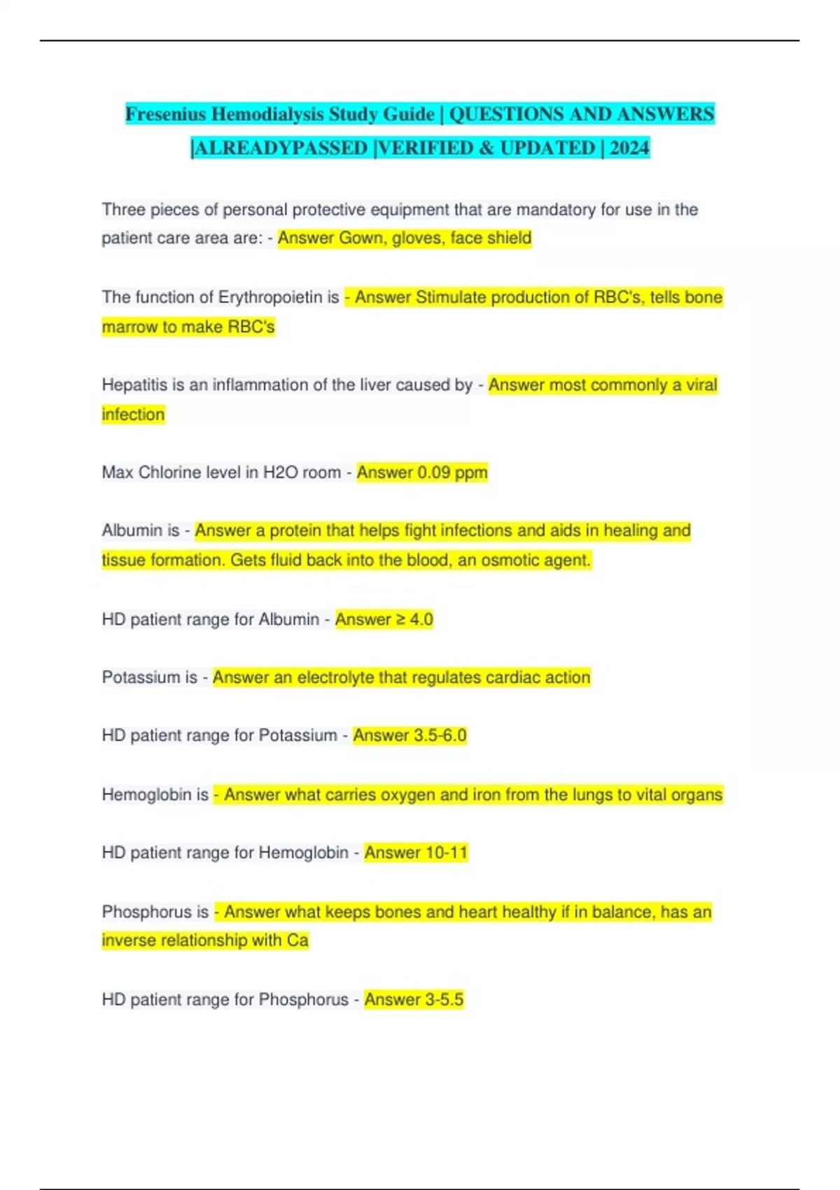 Fresenius Hemodialysis Study Guide | QUESTIONS AND ANSWERS |ALREADYPASSED |VERIFIED & UPDATED | 2024 Three pieces of personal protective equipment that are mandatory for use in the patient care area are: - Answer Gown, gloves, face shield The function of Erythropoietin is - Answer Stimulate production of RBC's, tells bone marrow to make RBC's Hepatitis is an inflammation of the liver caused by - Answer most commonly a viral infection Max Chlorine level in H2O room - Answer 0.09 ppm Albumin is - Answer a protein that helps fight infections and aids in healing and tissue formation. Gets fluid back into the blood, an osmotic agent. HD patient range for Albumin - Answer ≥ 4.0 Potassium is - Answer an electrolyte that regulates cardiac action HD patient range for Potassium - Answer 3.5-6.0 Hemoglobin is - Answer what carries oxygen and iron from the lungs to vital organs HD patient range for Hemoglobin - Answer 10-11 Phosphorus is - Answer what keeps bones and heart healthy if in balance, has an inverse relationship with Ca HD patient range for Phosphorus - Answer 3-5.5