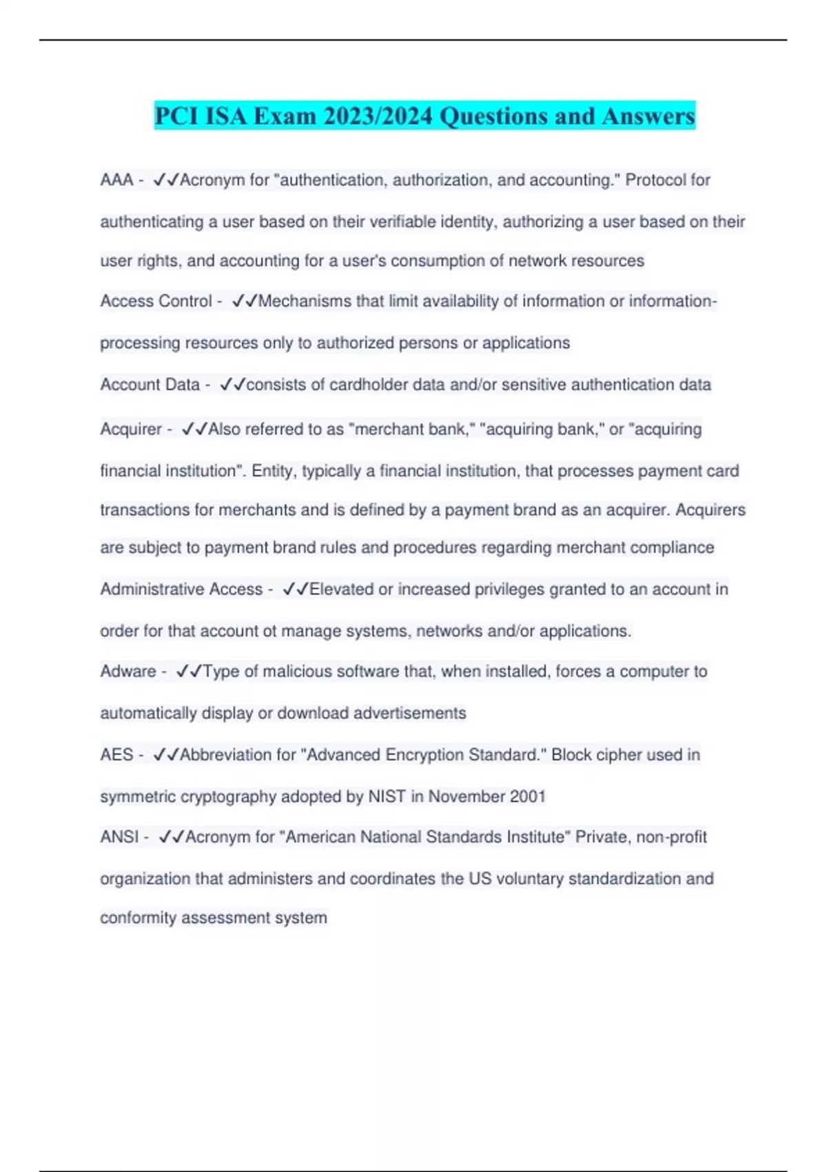 PCI ISA Exam 2023/2024 Questions and Answers AAA -️️ Acronym for "authentication, authorization, and accounting." Protocol for authenticating a user based on their verifiable identity, authorizing a user based on their user rights, and accounting for a user's consumption of network resources Access Control -️️ Mechanisms that limit availability of information or information- processing resources only to authorized persons or applications Account Data -️️ consists of cardholder data and/or sensitive authentication data Acquirer -️️ Also referred to as "merchant bank," "acquiring bank," or "acquiring financial institution". Entity, typically a financial institution, that processes payment card transactions for merchants and is defined by a payment brand as an acquirer. Acquirers are subject to payment brand rules and procedures regarding merchant compliance Administrative Access -️️ Elevated or increased privileges granted to an account in order for that account ot manage systems, networks and/or applications. Adware -️️ Type of malicious software that, when installed, forces a computer to automatically display or download advertisements AES -️️ Abbreviation for "Advanced Encryption Standard." Block cipher used in symmetric cryptography adopted by NIST in November 2001 ANSI -️️ Acronym for "American National Standards Institute" Private, non-profit organization that administers and coordinates the US voluntary standardization and conformity assessment system