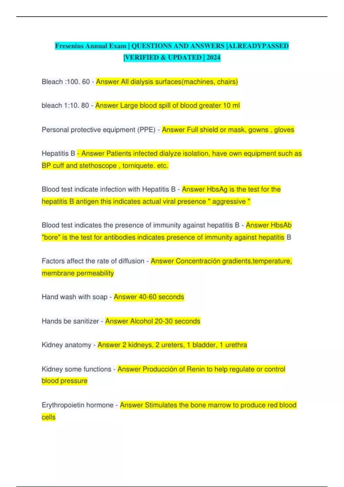Fresenius Annual Exam | QUESTIONS AND ANSWERS |ALREADYPASSED |VERIFIED & UPDATED | 2024 Bleach :100. 60 - Answer All dialysis surfaces(machines, chairs) bleach 1:10. 80 - Answer Large blood spill of blood greater 10 ml Personal protective equipment (PPE) - Answer Full shield or mask, gowns , gloves Hepatitis B - Answer Patients infected dialyze isolation, have own equipment such as BP cuff and stethoscope , torniquete. etc. Blood test indicate infection with Hepatitis B - Answer HbsAg is the test for the hepatitis B antigen this indicates actual viral presence " aggressive " Blood test indicates the presence of immunity against hepatitis B - Answer HbsAb "bore" is the test for antibodies indicates presence of immunity against hepatitis B Factors affect the rate of diffusion - Answer Concentración gradients,temperature, membrane permeability Hand wash with soap - Answer 40-60 seconds Hands be sanitizer - Answer Alcohol 20-30 seconds Kidney anatomy - Answer 2 kidneys, 2 ureters, 1 bladder, 1 urethra Kidney some functions - Answer Producción of Renin to help regulate or control blood pressure Erythropoietin hormone -