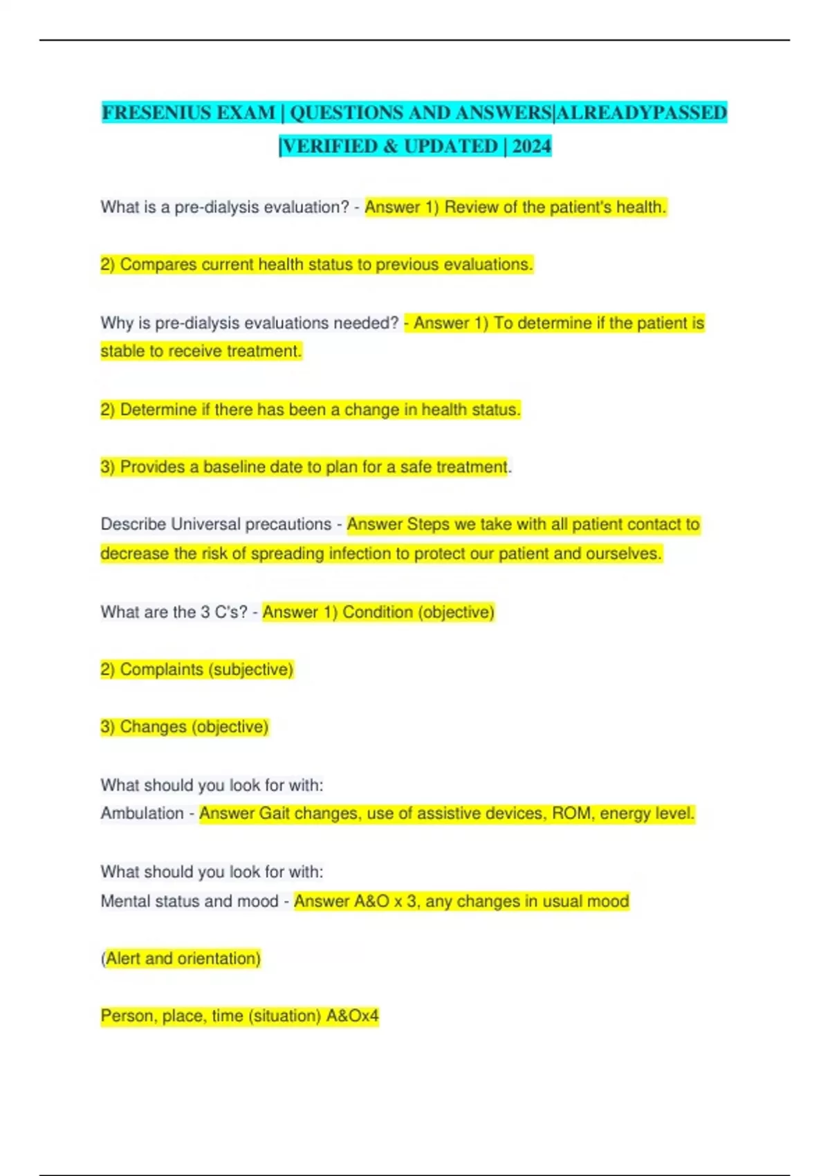 FRESENIUS EXAM | QUESTIONS AND ANSWERS|ALREADYPASSED |VERIFIED & UPDATED | 2024 What is a pre-dialysis evaluation? - Answer 1) Review of the patient's health. 2) Compares current health status to previous evaluations. Why is pre-dialysis evaluations needed? - Answer 1) To determine if the patient is stable to receive treatment. 2) Determine if there has been a change in health status. 3) Provides a baseline date to plan for a safe treatment. Describe Universal precautions - Answer Steps we take with all patient contact to decrease the risk of spreading infection to protect our patient and ourselves. What are the 3 C's? - Answer 1) Condition (objective) 2) Complaints (subjective) 3) Changes (objective) What should you look for with: Ambulation - Answer Gait changes, use of assistive devices, ROM, energy level. What should you look for with