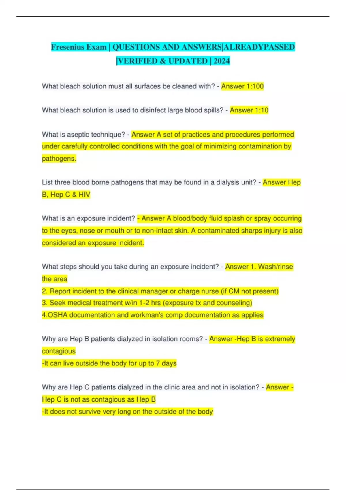 Fresenius Exam | QUESTIONS AND ANSWERS|ALREADYPASSED |VERIFIED & UPDATED | 2024 What bleach solution must all surfaces be cleaned with? - Answer 1:100 What bleach solution is used to disinfect large blood spills? - Answer 1:10 What is aseptic technique? - Answer A set of practices and procedures performed under carefully controlled conditions with the goal of minimizing contamination by pathogens. List three blood borne pathogens that may be found in a dialysis unit? - Answer Hep B, Hep C & HIV What is an exposure incident? - Answer A blood/body fluid splash or spray occurring to the eyes, nose or mouth or to non-intact skin. A contaminated sharps injury is also considered an exposure incident. What steps should you take during an exposure incident? - Answer 1. Wash/rinse the area 2. Report incident to the clinical manager or charge nurse (if CM not present) 3. Seek medical treatment w/in 1-2 hrs (exposure tx and counseling) 4.OSHA documentation and workman's comp documentation as applies Why are Hep B patients dialyzed in isolation rooms?