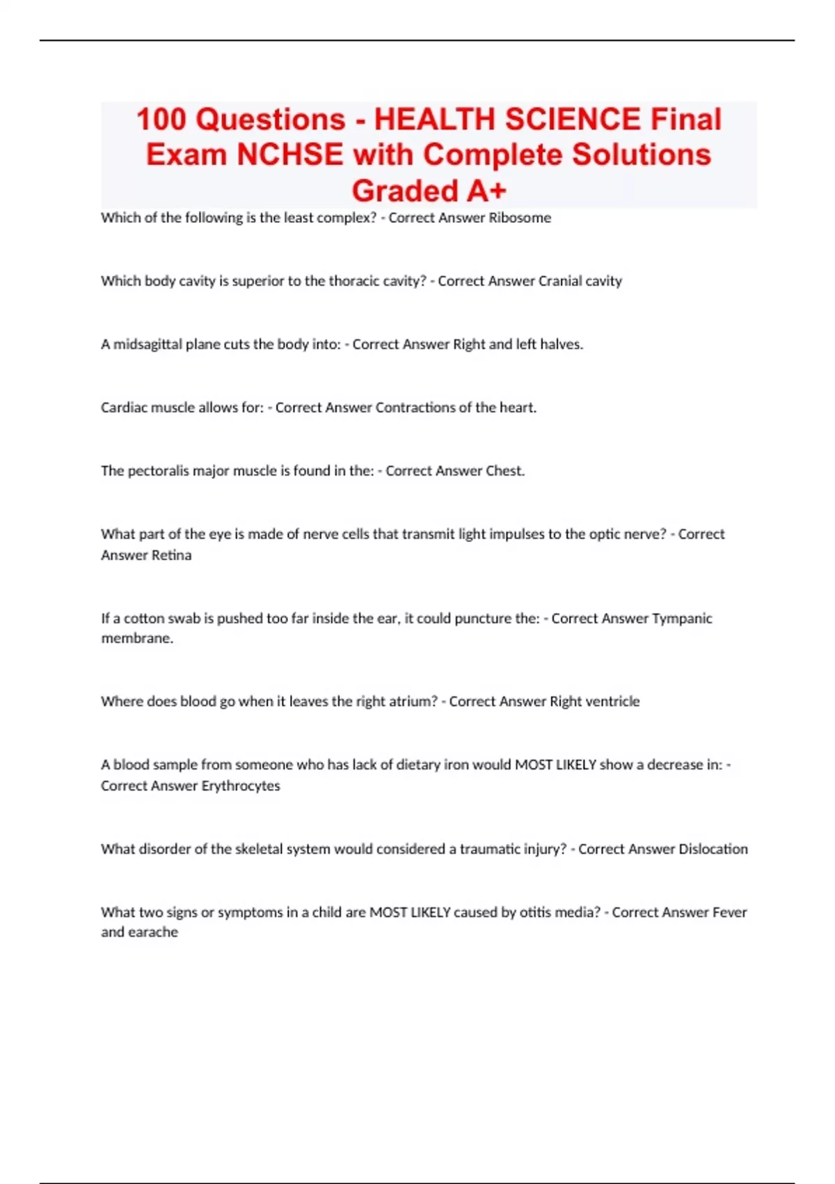 100 Questions - HEALTH SCIENCE Final Exam NCHSE with Complete Solutions Graded A+ Which of the following is the least complex? - Correct Answer Ribosome Which body cavity is superior to the thoracic cavity? - Correct Answer Cranial cavity A midsagittal plane cuts the body into: - Correct Answer Right and left halves. Cardiac muscle allows for: - Correct Answer Contractions of the heart. The pectoralis major muscle is found in the: - Correct Answer Chest. What part of the eye is made of nerve cells that transmit light impulses to the optic nerve? - Correct Answer Retina If a cotton swab is pushed too far inside the ear, it could puncture the: - Correct Answer Tympanic membrane. Where does blood go when it leaves the right atrium? - Correct Answer Right ventricle A blood sample from someone who has lack of dietary iron would MOST LIKELY show a decrease in: - Correct Answer Erythrocytes What disorder of the skeletal system would considered a traumatic injury? - Correct Answer Dislocation What two signs or symptoms in a child are MOST LIKELY caused by otitis media? - Correct Answer Fever and earache