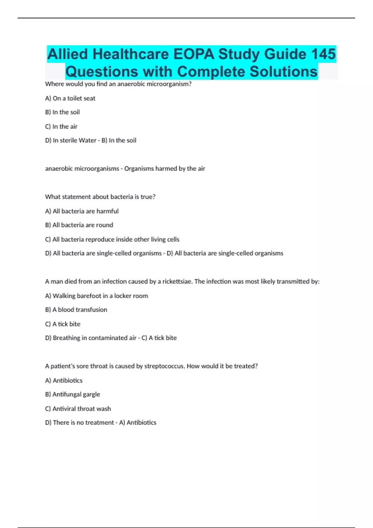 Allied Healthcare EOPA Study Guide 145 Questions with Complete Solutions Where would you find an anaerobic microorganism? A) On a toilet seat B) In the soil C) In the air D) In sterile Water - B) In the soil anaerobic microorganisms - Organisms harmed by the air What statement about bacteria is true? A) All bacteria are harmful B) All bacteria are round C) All bacteria reproduce inside other living cells D) All bacteria are single-celled organisms - D) All bacteria are single-celled organisms A man died from an infection caused by a rickettsiae. The infection was most likely transmitted by: A) Walking barefoot in a locker room B) A blood transfusion C) A tick bite D) Breathing in contaminated air - C) A tick bite A patient's sore throat is caused by streptococcus. How would it be treated? A) Antibiotics B) Antifungal gargle C) Antiviral throat wash D) There is no treatment - A) Antibiotics What organism can only be