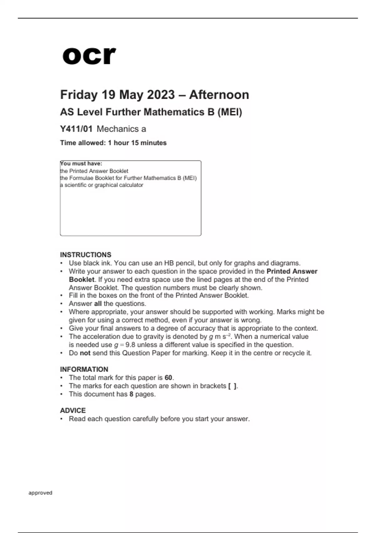 ocr AS Level Further Mathematics B (MEI) Y411-01 QUESTION PAPER May2023.