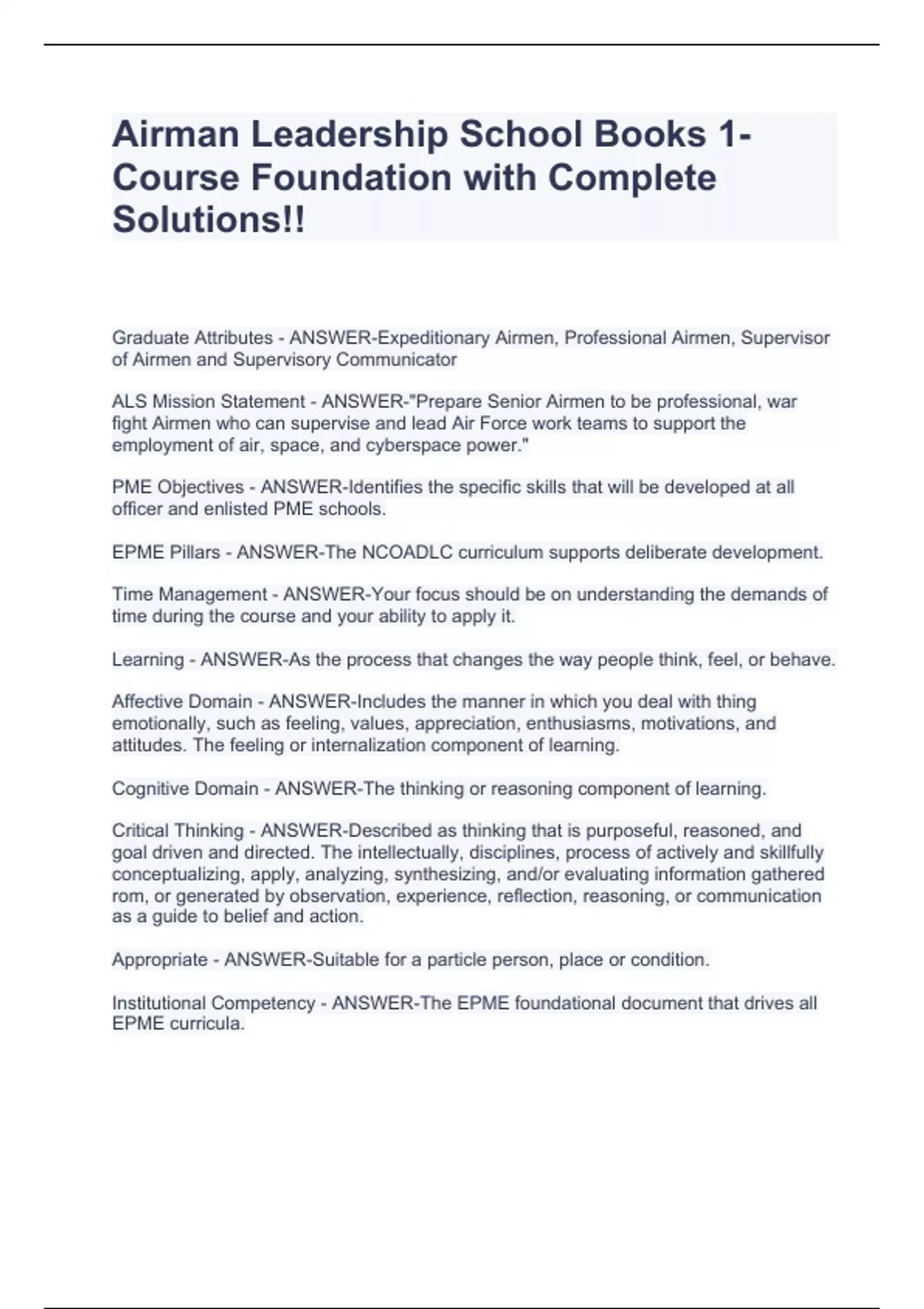 ALS Mission Statement - ANSWER-"Prepare Senior Airmen to be professional, war fight Airmen who can supervise and lead Air Force work teams to support the employment of air, space, and cyberspace power." PME Objectives - ANSWER-Identifies the specific skills that will be developed at all officer and enlisted PME schools. EPME Pillars - ANSWER-The NCOADLC curriculum supports deliberate development. Time Management - ANSWER-Your focus should be on understanding the demands of time during the course and your ability to apply it. Learning - ANSWER-As the process that changes the way people think, feel, or behave. Affective Domain - ANSWER-Includes the manner in which you deal with thing emotionally, such as feeling, values, appreciation, enthusiasms, motivations, and attitudes. The feeling or internalization component of learning. Cognitive Domain - ANSWER-The thinking or reasoning component of learning. Critical Thinking - ANSWER-Described as thinking that is purposeful, reasoned, and goal driven and directed. The intellectually, disciplines, process of actively and skillfully conceptualizing, apply, analyzing, synthesizing, and/or evaluating information gathered rom, or generated by observation, experience, reflection, reasoning, or communication as a guide to belief and action. Appropriate - ANSWER-Suitable for a particle person, place or condition. Institutional Competency - ANSWER-The EPME foundational document that drives all EPME curricula.