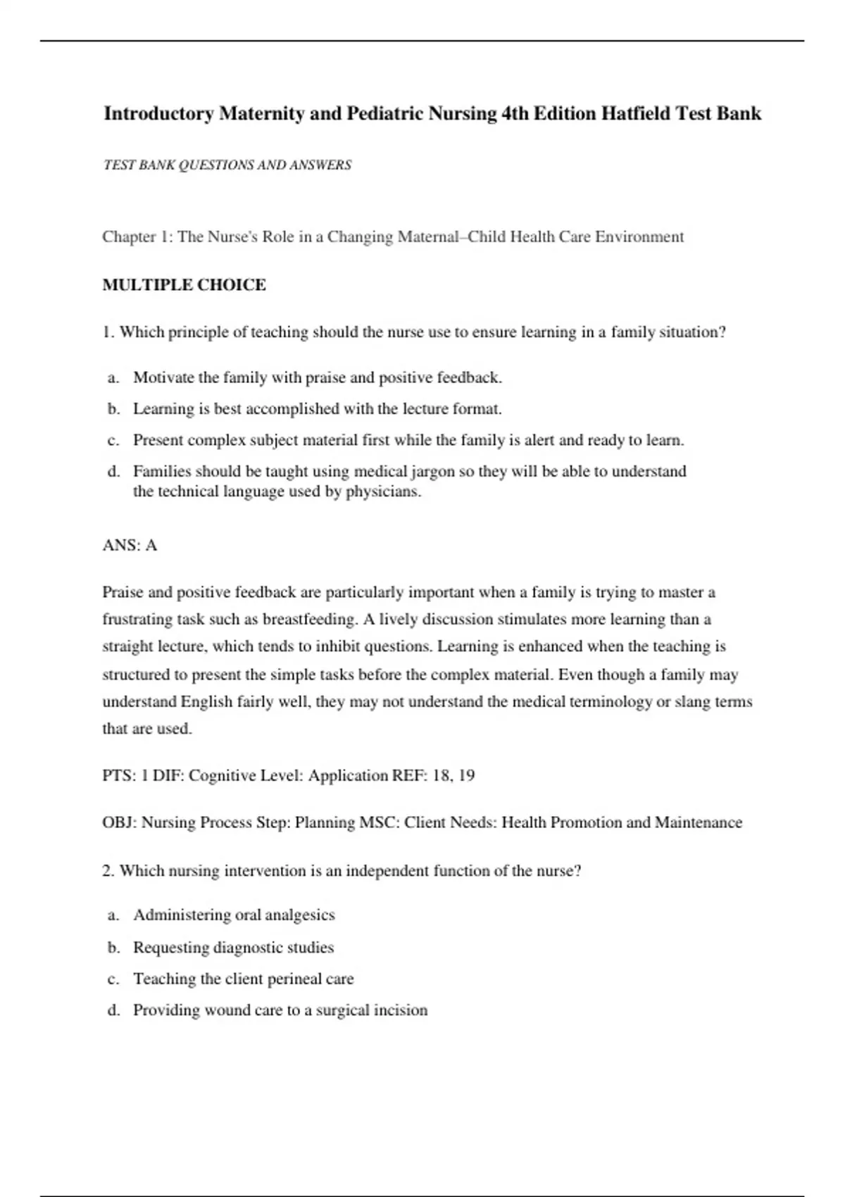 Introductory Maternity and Pediatric Nursing 4th Edition Hatfield Test Bank Which principle of teaching should the nurse use to ensure learning in a family situation?