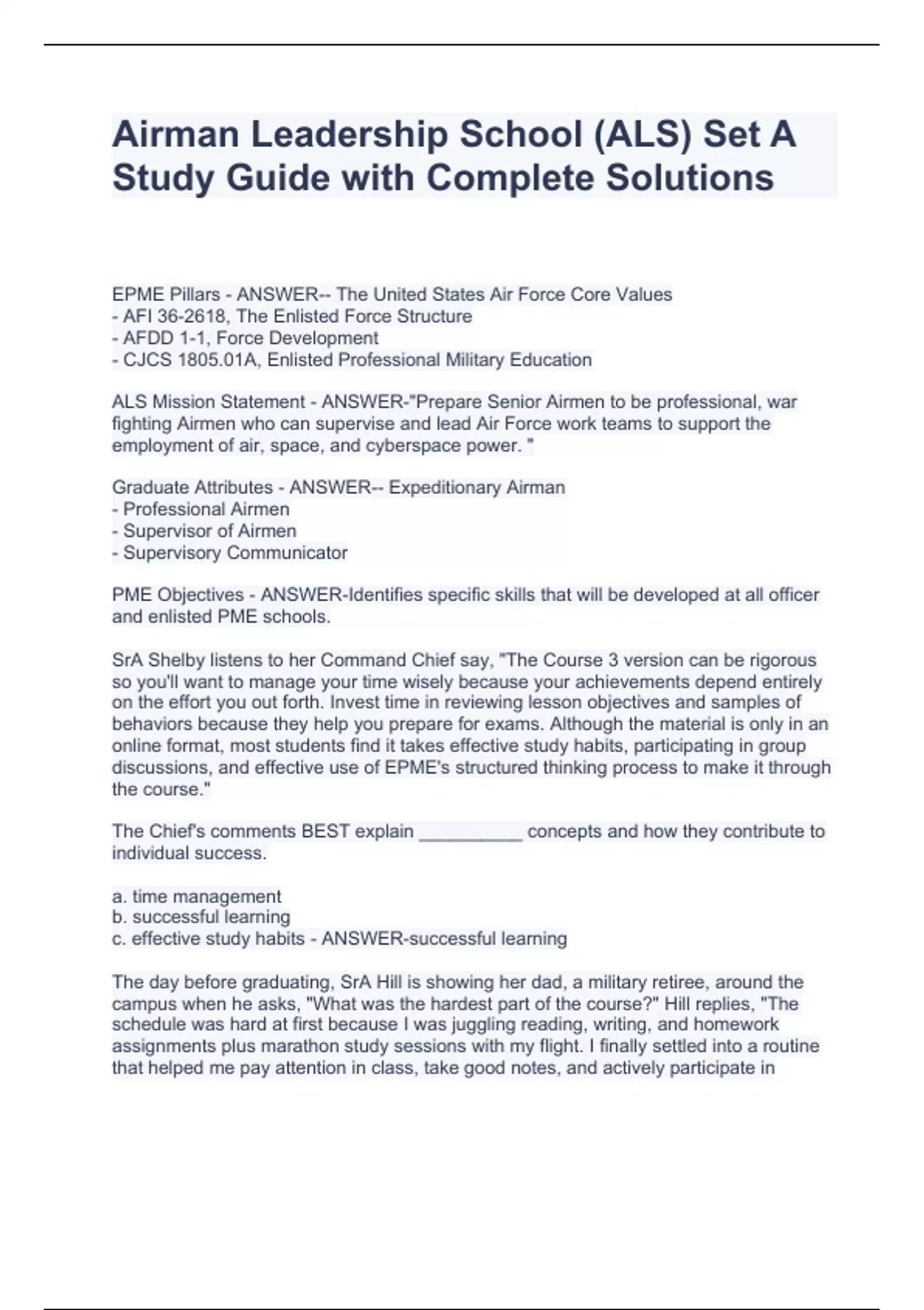 EPME Pillars - ANSWER-- The United States Air Force Core Values - AFI 36-2618, The Enlisted Force Structure - AFDD 1-1, Force Development - CJCS 1805.01A, Enlisted Professional Military Education ALS Mission Statement - ANSWER-"Prepare Senior Airmen to be professional, war fighting Airmen who can supervise and lead Air Force work teams to support the employment of air, space, and cyberspace power. " Graduate Attributes - ANSWER-- Expeditionary Airman - Professional Airmen - Supervisor of Airmen - Supervisory Communicator PME Objectives - ANSWER-Identifies specific skills that will be developed at all officer and enlisted PME schools. SrA Shelby listens to her Command Chief say, "The Course 3 version can be rigorous so you'll want to manage your time wisely because your achievements depend entirely on the effort you out forth. Invest time in reviewing lesson objectives and samples of behaviors because they help you prepare for exams. Although the material is only in an online format, most students find it takes effective study habits, participating in group discussions, and effective use of EPME's structured thinking process to make it through the course." The Chief's comments BEST explain __________ concepts and how they contribute to individual success. a. time management b. successful learning c. effective study habits - ANSWER-successful learning The day before graduating, SrA Hill is showing her dad, a military retiree, around the campus when he asks, "What was the hardest part of the course?" Hill replies, "The schedule was hard at first because I was juggling reading, writing, and homework assignments plus marathon study sessions with my flight. I finally settled into a routine that helped me pay attention in class, take good notes, and actively participate in clas