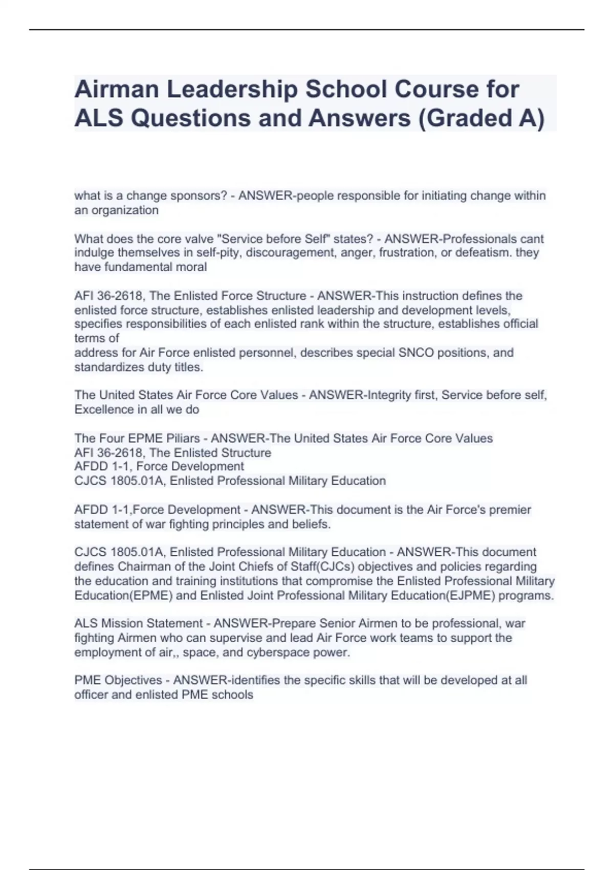 what is a change sponsors? - ANSWER-people responsible for initiating change within an organization What does the core valve "Service before Self" states? - ANSWER-Professionals cant indulge themselves in self-pity, discouragement, anger, frustration, or defeatism. they have fundamental moral AFI 36-2618, The Enlisted Force Structure - ANSWER-This instruction defines the enlisted force structure, establishes enlisted leadership and development levels, specifies responsibilities of each enlisted rank within the structure, establishes official terms of address for Air Force enlisted personnel, describes special SNCO positions, and standardizes duty titles. The United States Air Force Core Values - ANSWER-Integrity first, Service before self, Excellence in all we do The Four EPME Piliars - ANSWER-The United States Air Force Core Values AFI 36-2618, The Enlisted Structure AFDD 1-1, Force Development CJCS 1805.01A, Enlisted Professional Military Education AFDD 1-1,Force Development - ANSWER-This document is the Air Force's premier statement of war fighting principles and beliefs. CJCS 1805.01A, Enlisted Professional Military Education - ANSWER-This document defines Chairman of the Joint Chiefs of Staff(CJCs) objectives and policies regarding the education and training institutions that compromise the Enlisted Professional Military Education(EPME) and Enlisted Joint Professional Military Education(EJPME) programs. ALS Mission Statement - ANSWER-Prepare Senior Airmen to be professional, war fighting Airmen who can supervise and lead Air Force work teams to support the employment of air,, space, and cyberspace power. PME Objectives - ANSWER-identifies the specific skills that will be developed at all officer and enlisted PME schools