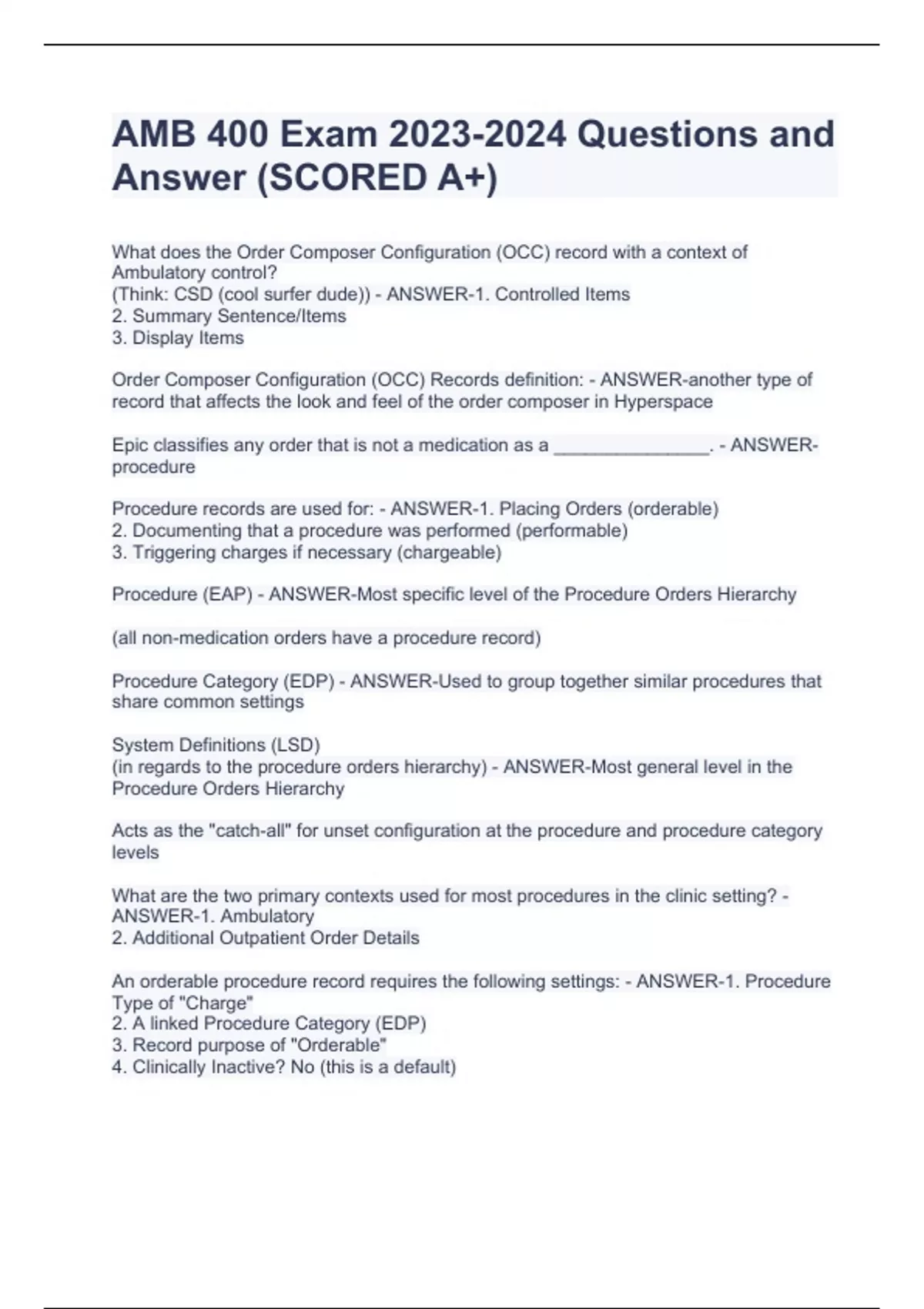 What does the Order Composer Configuration (OCC) record with a context of Ambulatory control? (Think: CSD (cool surfer dude)) - ANSWER-1. Controlled Items 2. Summary Sentence/Items 3. Display Items Order Composer Configuration (OCC) Records definition: - ANSWER-another type of record that affects the look and feel of the order composer in Hyperspace Epic classifies any order that is not a medication as a _______________. - ANSWER-procedure Procedure records are used for: - ANSWER-1. Placing Orders (orderable) 2. Documenting that a procedure was performed (performable) 3. Triggering charges if necessary (chargeable) Procedure (EAP) - ANSWER-Most specific level of the Procedure Orders Hierarchy (all non-medication orders have a procedure record) Procedure Category (EDP) - ANSWER-Used to group together similar procedures that share common settings System Definitions (LSD) (in regards to the procedure orders hierarchy) - ANSWER-Most general level in the Procedure Orders Hierarchy Acts as the "catch-all" for unset configuration at the procedure and procedure category levels What are the two primary contexts used for most procedures in the clinic setting? - ANSWER-1. Ambulatory 2. Additional Outpatient Order Details An orderable procedure record requires the following settings: - ANSWER-1. Procedure Type of "Charge" 2. A linked Procedure Category (EDP) 3. Record purpose of "Orderable" 4. Clinically Inactive? No (this is a default)