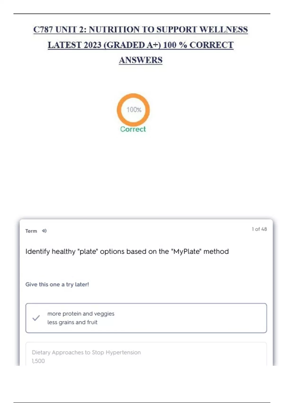 C787 UNIT 2: NUTRITION TO SUPPORT WELLNESS LATEST 2023 (GRADED A+) 100 % CORRECT ANSWERS