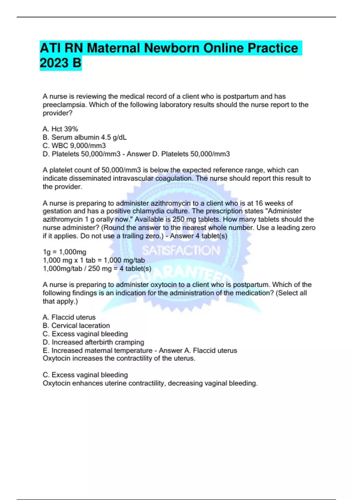 A nurse is reviewing the medical record of a client who is postpartum and has preeclampsia. Which of the following laboratory results should the nurse report to the provider? A. Hct 39% B. Serum albumin 4.5 g/dL C. WBC 9,000/mm3 D. Platelets 50,000/mm3 - Answer D. Platelets 50,000/mm3 A platelet count of 50,000/mm3 is below the expected reference range, which can indicate disseminated intravascular coagulation. The nurse should report this result to the provider. A nurse is preparing to administer azithromycin to a client who is at 16 weeks of gestation and has a positive chlamydia culture. The prescription states "Administer azithromycin 1 g orally now." Available is 250 mg tablets. How many tablets should the nurse administer? (Round the answer to the nearest whole number. Use a leading zero if it applies. Do not use a trailing zero.) - Answer 4 tablet(s) 1g = 1,000mg 1,000 mg x 1 tab = 1,000 mg/tab 1,000mg/tab / 250 mg = 4 tablet(s) A nurse is preparing