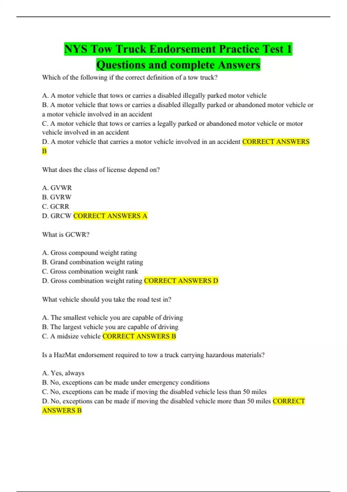 NYS Tow Truck Endorsement Practice Test 1 Questions and complete Answers