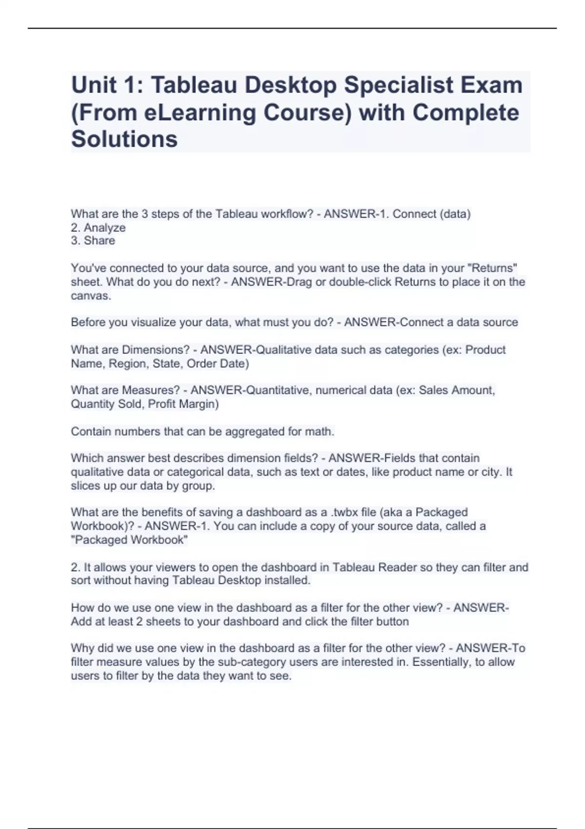 Unit 1: Tableau Desktop Specialist Exam (From eLearning Course) with Complete Solutions Unit 1: Tableau Desktop Specialist Exam (From eLearning Course) with Complete Solutions Unit 1: Tableau Desktop Specialist Exam (From eLearning Course) with Complete Solutions What are the 3 steps of the Tableau workflow? - ANSWER-1. Connect (data) 2. Analyze 3. Share You've connected to your data source, and you want to use the data in your "Returns" sheet. What do you do next? - ANSWER-Drag or double-click Returns to place it on the canvas. Before you visualize your data, what must you do? - ANSWER-Connect a data source What are Dimensions? - ANSWER-Qualitative data such as categories (ex: Product Name, Region, State, Order Date) What are Measures? - ANSWER-Quantitative, numerical data (ex: Sales Amount, Quantity Sold, Profit Margin)