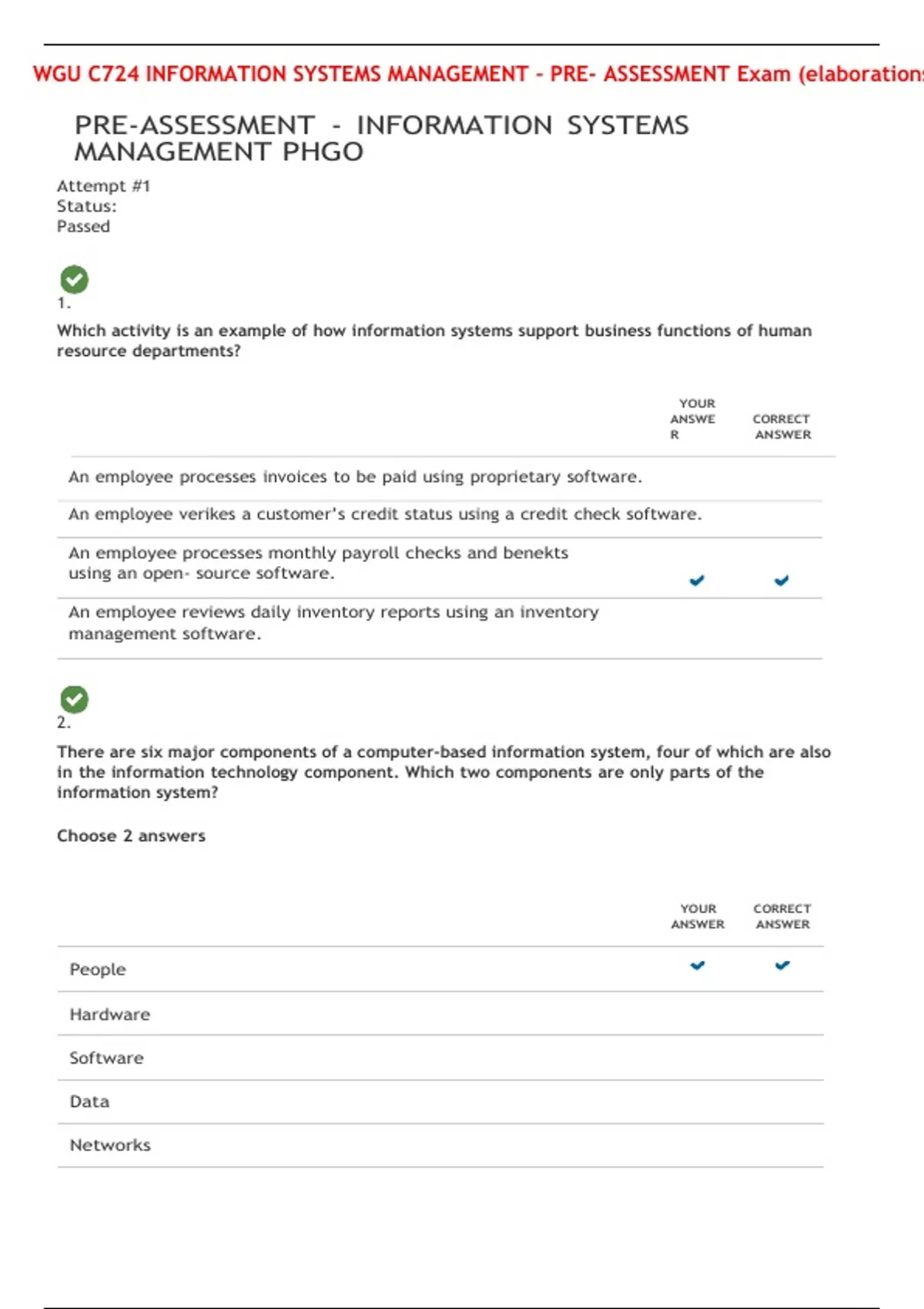 WGU C724 INFORMATION SYSTEMS MANAGEMENT – PRE- ASSESSMENT Exam (elaborations) Which activity is an example of how information systems support business functions of human resource departments? YOUR ANSWE R CORRECT ANSWER An employee processes invoices to be paid using proprietary software. An employee verikes a customer’s credit status using a credit check software. An employee processes monthly payroll checks and benekts using an open- source software. An employee reviews daily inventory reports using an inventory management software.