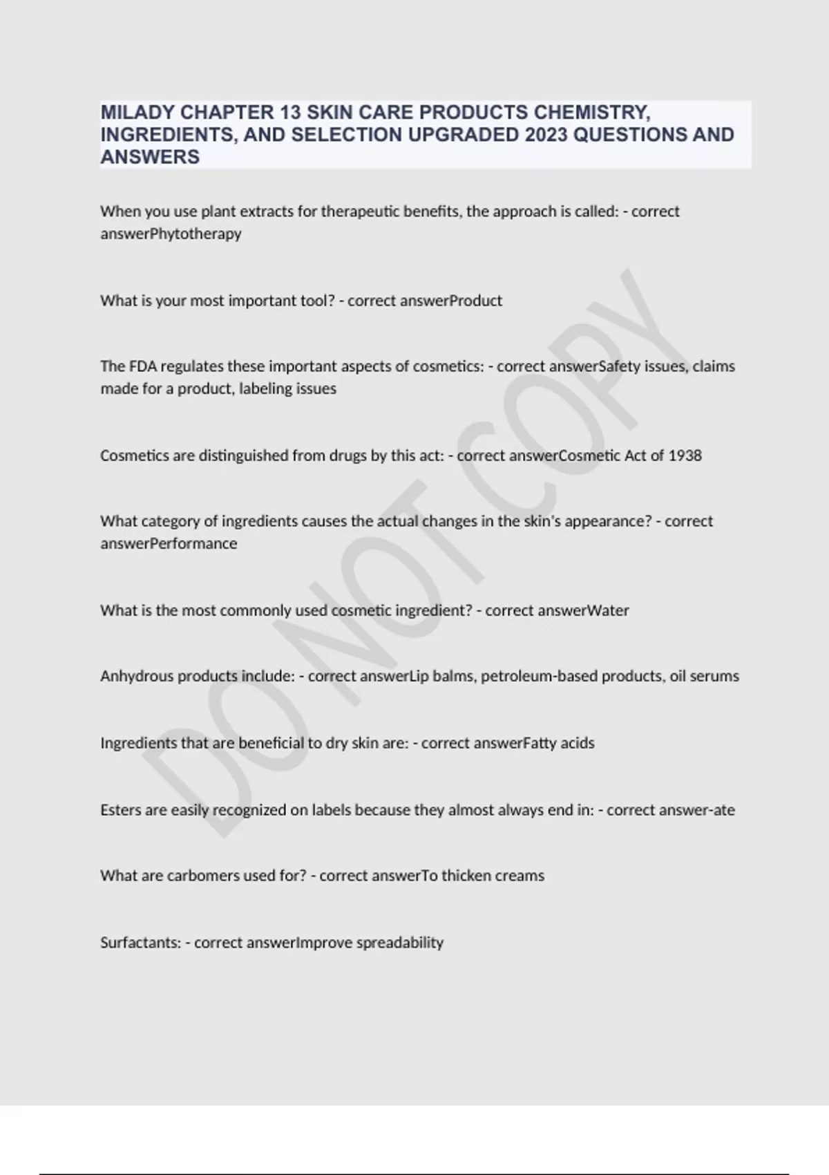MILADY CHAPTER 13 SKIN CARE PRODUCTS CHEMISTRY, INGREDIENTS, AND SELECTION UPGRADED 2023 QUESTIONS AND ANSWERS
