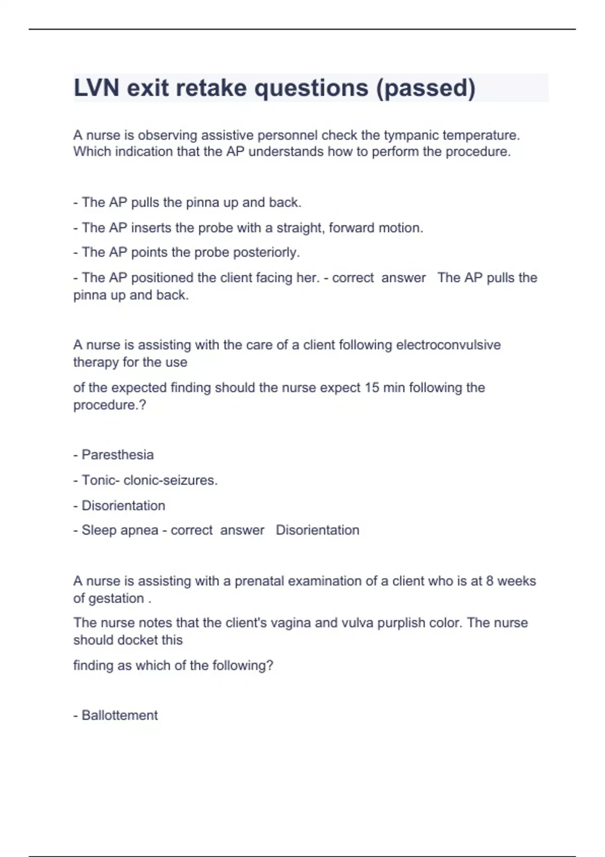 LVN exit retake questions and answers correctly solved 2023/2024A nurse is observing assistive personnel check the tympanic temperature. Which indication that the AP understands how to perform the procedure. - The AP pulls the pinna up and back. - The AP inserts the probe with a straight, forward motion. - The AP points the probe posteriorly. - The AP positioned the client facing her. - correct answer The AP pulls the pinna up and back. A nurse is assisting with the care of a client following electroconvulsive therapy for the