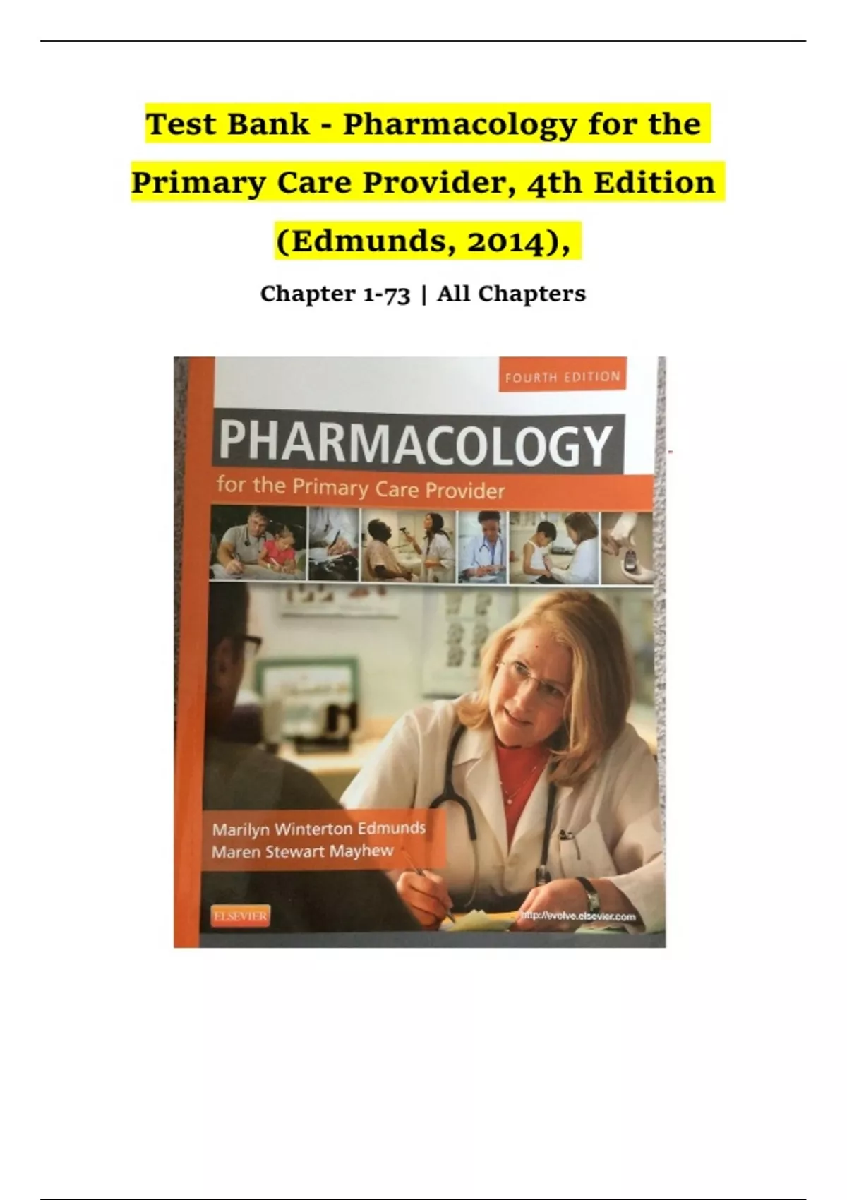 Test Bank - Pharmacology for the Primary Care Provider, 4th Edition (Edmunds, 2014), Chapter 1-73 | All Chapters 1.Which of the following has influenced an emphasis on primary care education in medical schools? a. Changes in Medicare reimbursement methods recommended in 1992 b. Competition from nonphysicians desiring to meet primary care shortages c. The need for monopolistic control in the marketplace of primary outpatient care d. The recognition that nonphysicians have variable success providing primary care ANS: A The Physician Payment Review Commission in 1992 directly increased financial reimbursement to clinicians who provide primary care. Coupled with a shortage of primary care providers, this incentive led medical schools to place greater emphasis on preparing primary care physicians. Competition from nonphysicians increased coincidentally as professionals from other disciplines stepped up to meet the needs. Nonphysicians have had increasing success at providing primary care and have been shown to be safe and effective. DIF: Cognitive Level: Remembering (Knowledge) REF: 2 2.As primary care nurse practitioners (NPs) continue to develop their role as prescribers of medications, it will be important to: a. attain the same level of expertise as physicians who currently prescribe medications. b. learn from the experiences of physicians and develop expertise based on evidence- based practice. c. maintain collaborative and supervisorial relationships with physicians who will oversee prescribing practices. d. develop relationships with pharmaceutical representatives to learn about new medications as they are developed. ANS: B As nonphysicians develop the roles associated with prescriptive authority, it will be important to learn from the past experiences of physicians and to develop prescribing practices based on evidence-based medicine. It is hoped that all prescribers, including physicians and nurse practitioners, will strive to do better than in the past. NPs should work toward prescriptive authority and for practice that is not supervised by another professional. Pharmaceutical representatives provide information that carries some bias. Academic sources are better. DIF: Cognitive Level: Applying (Application) REF: 4